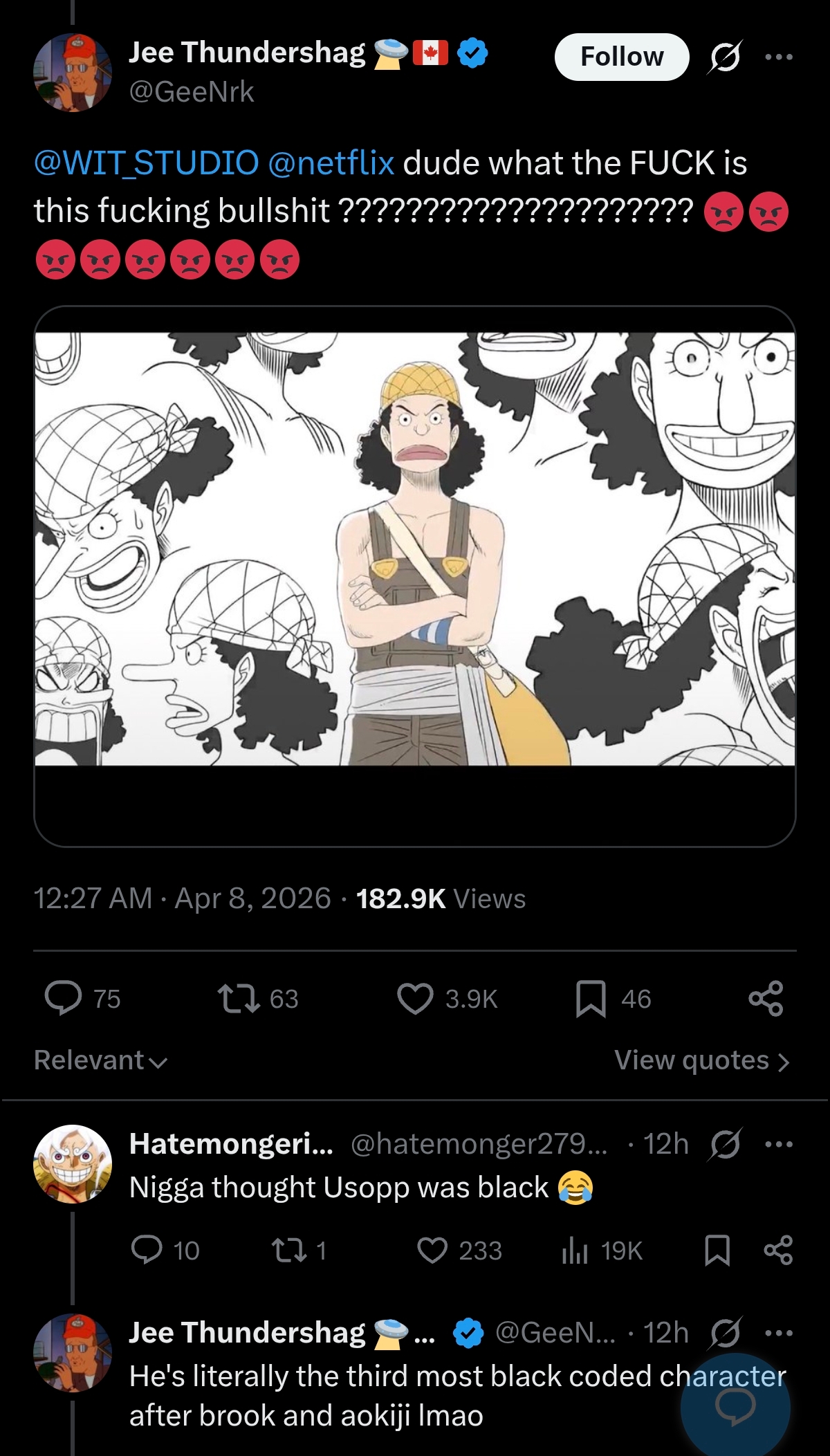 blacks are going apeshit about usopp being white-skinned in the one piece remake