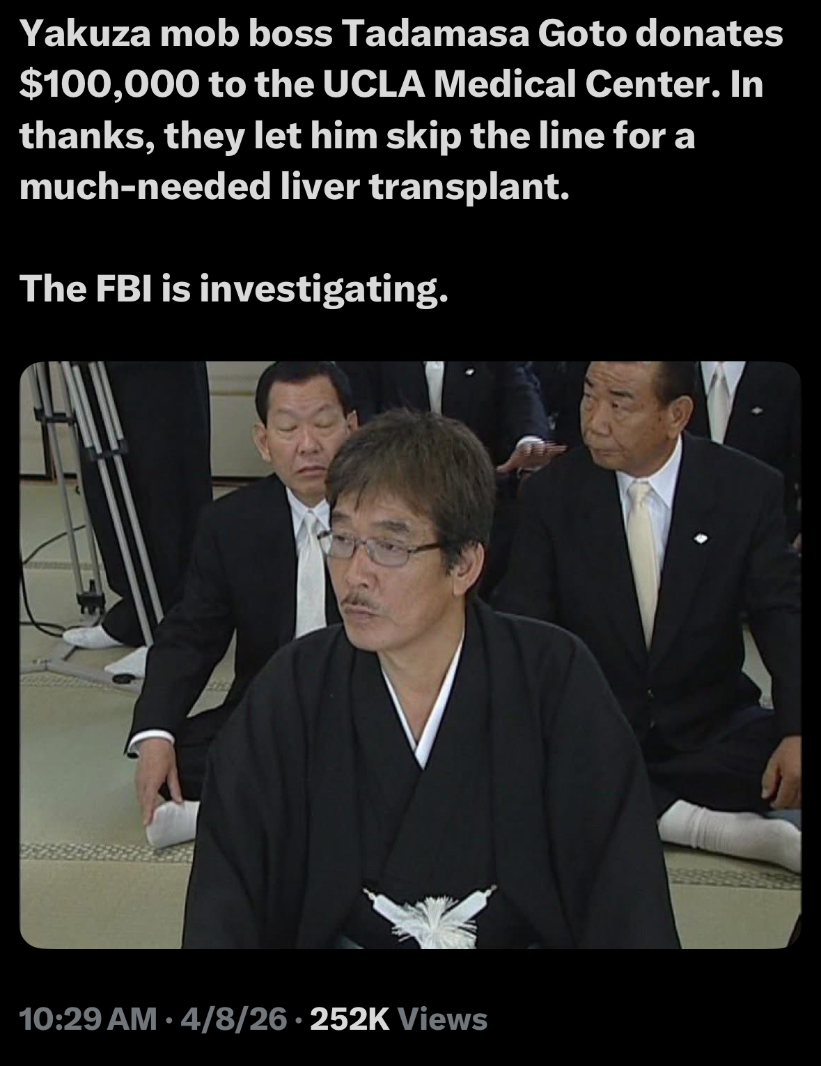 >>220599843As stated in the thread already, last year one of their leaders got busted trying to sell weapons grade nuclear materials on the black market to get an insurgent group in Myanmar some SAM's, and they regularly donate millions of dollars in gold for disaster relief anytime theres a natural disaster in Japan. They clearly have a ton of black market connections and money to throw around. Theyre a lot more international these days and get up to a lot of fuckery in SEA and the Phillipines