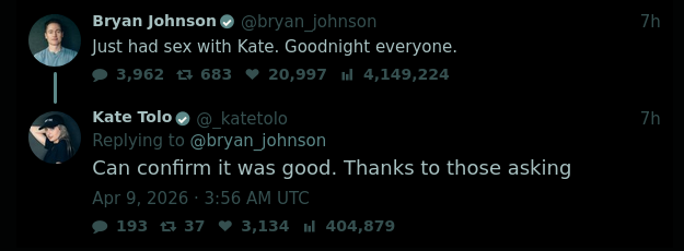 The guy who is trying to stop himself ageing announced this on Twitter for some reasonhttps://nitter.poast.org/_katetolo/status/2042089357272871089