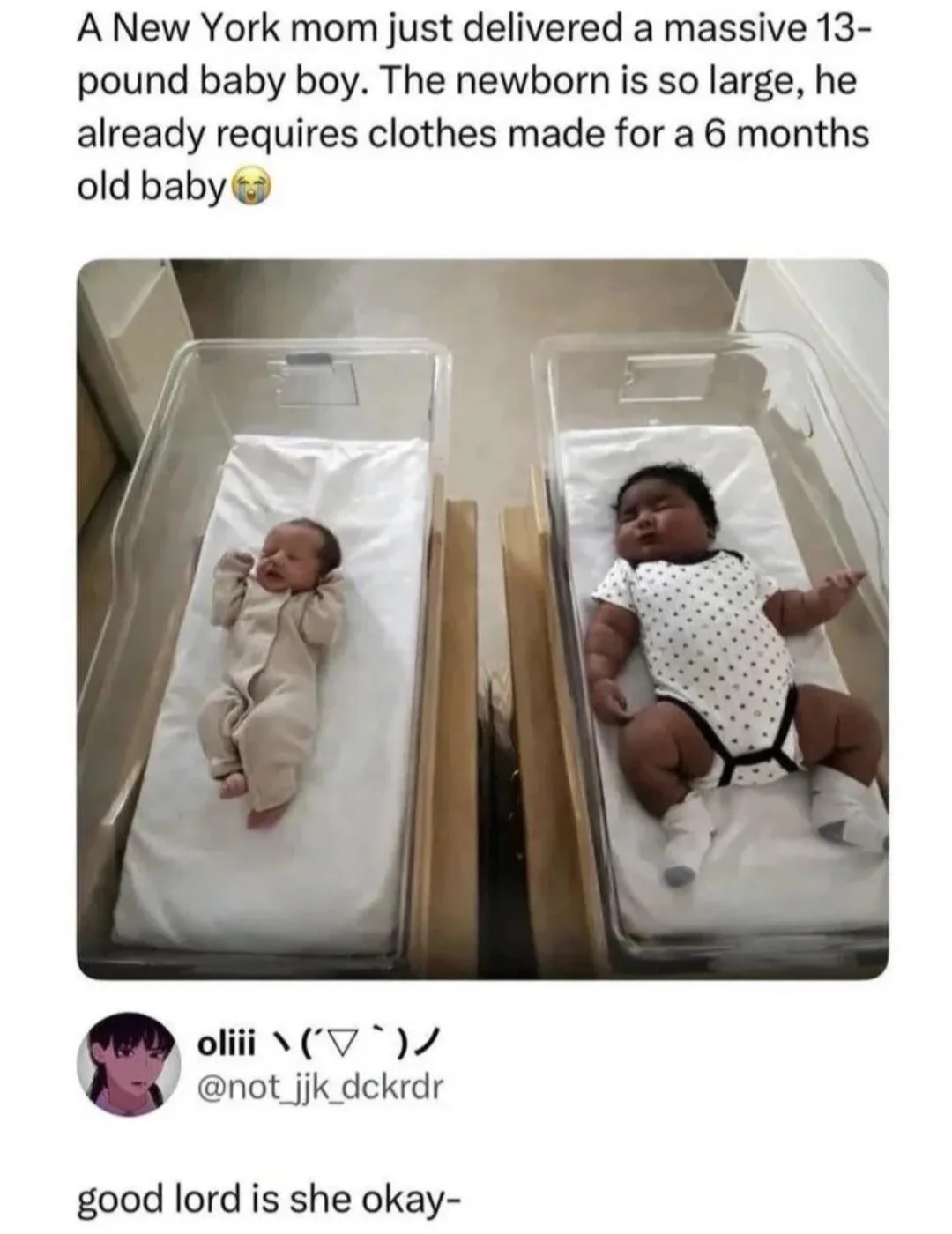 >>220654670This just unfortunately means that she's probably a really poorly controlled diabetic. Babies are meant to all be around the same size