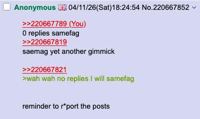 >>2206677890 replies samefag>>220667819saemag yet another gimmick>>220667821>wah wah no replies I will samefagreminder to r*port the posts