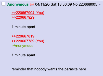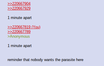 >>220667904>>2206679291 minute apart>>220667819>>220667789>Anonymous1 minute apart reminder that nobody wants the parasite here