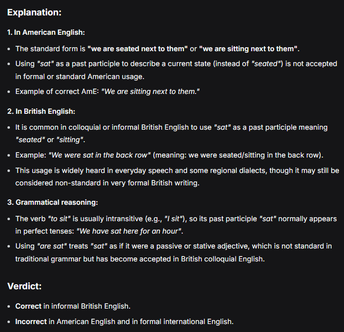 i already told you it's how Brits talk. americans don't say "we are sat"