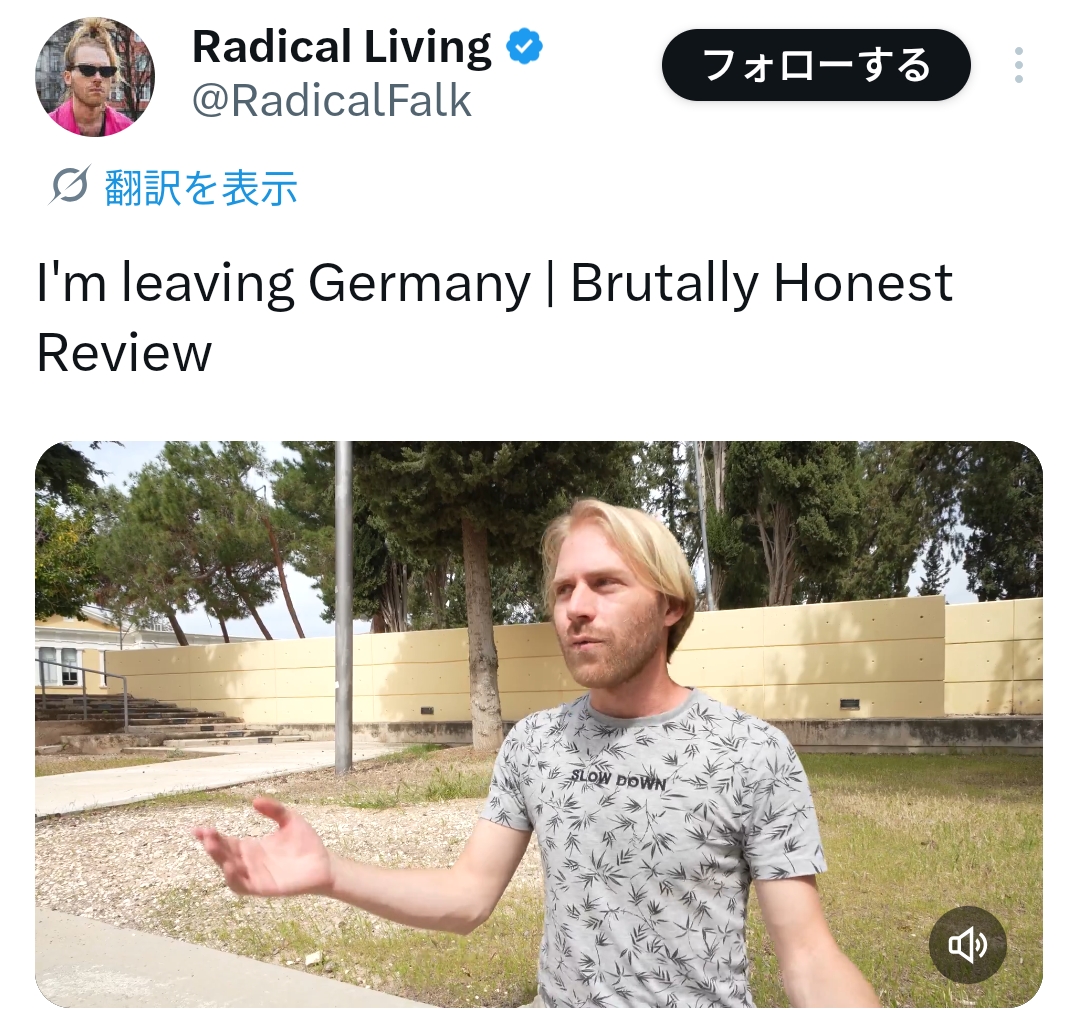 https://youtu.be/HQvSItqdd5o?si=NsVIzYRbUO1QHKlB逆にドイツに行きたいんだが…。そんなに悪いのかな。
