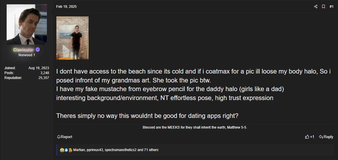 >>220702048My theory is that manosphere shite on the internet has done a number on young men. It exploits their insecurities. Young men in past generations weren't exposed to stuff like that. Instead you had to go outside to meet real people, and you'd see they were like you: not perfect, not as big as Arnie, not "looksmaxxing".
