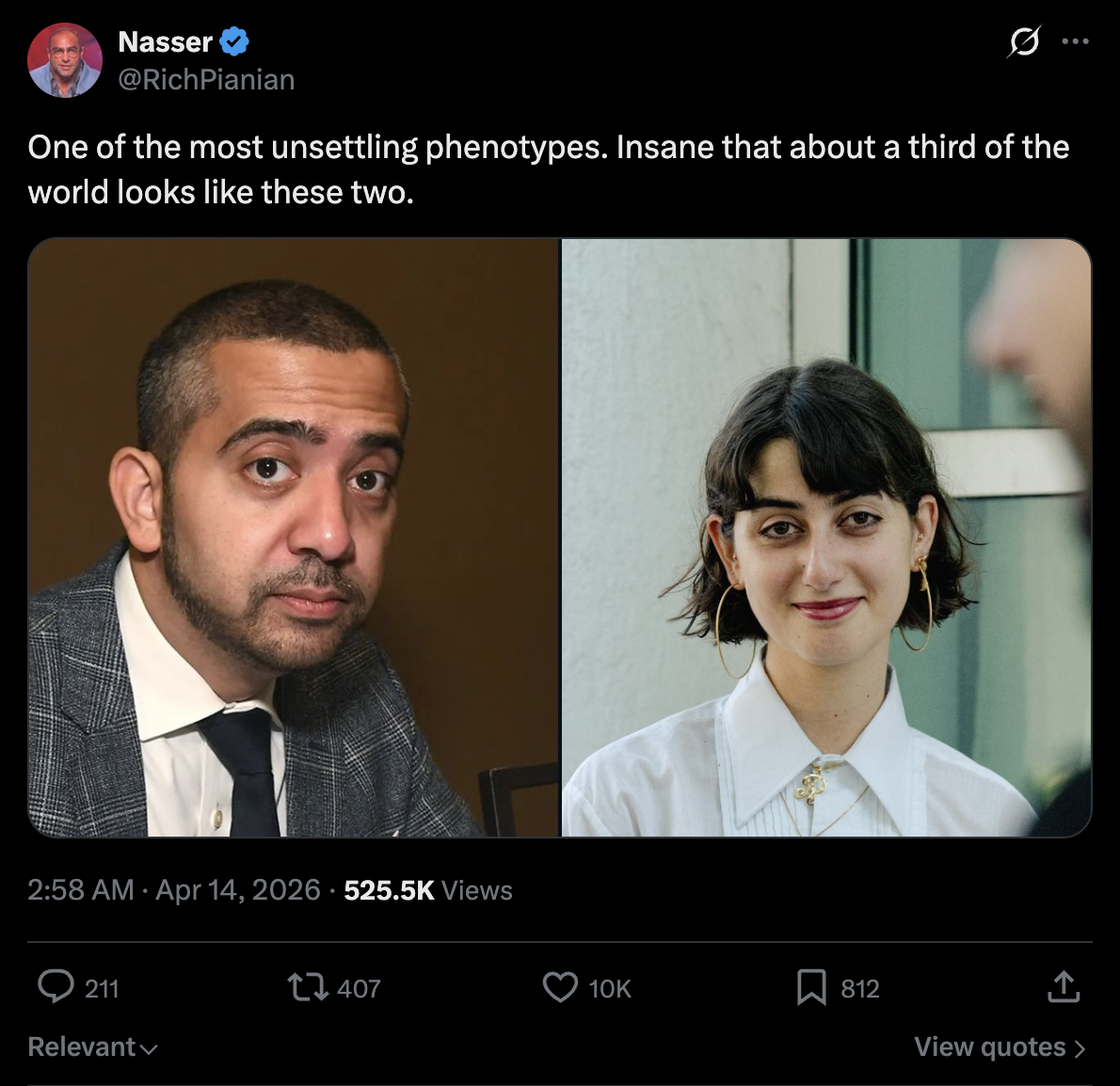 Mehdi has a very high set supraorbital, lack of periorbital fat, I do believe he is a paki so his MFR isn't totally off. She has bulging sallow-set eyes(her eyeballs protrude due to existing fat inside the socket)