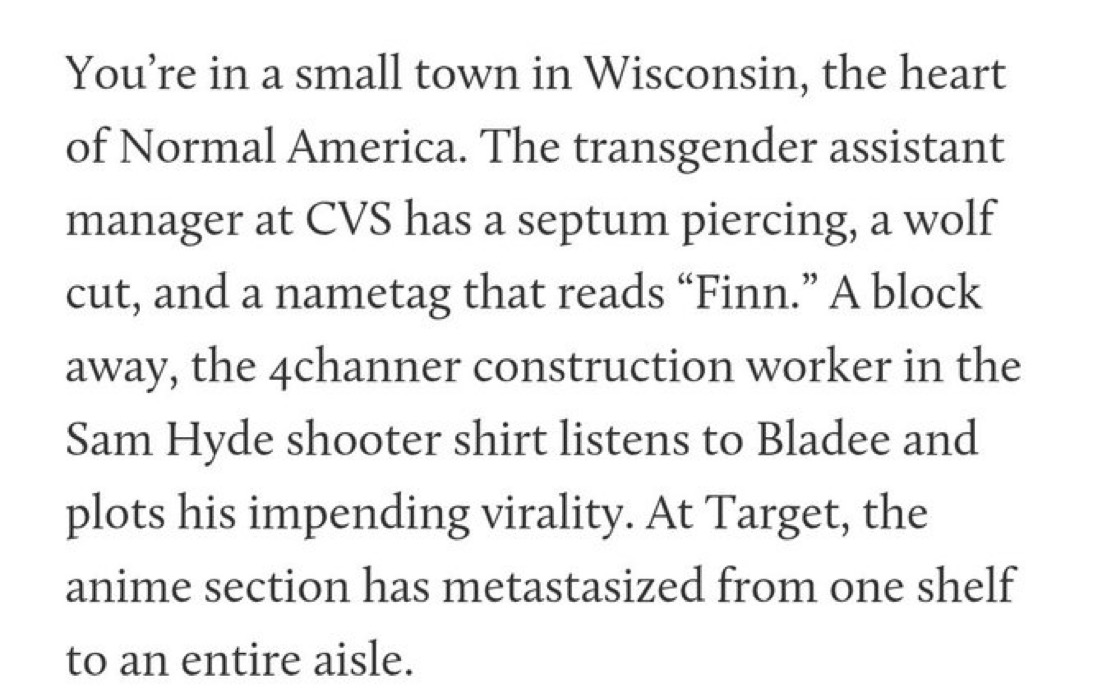 >Two troons at work, an ftm and mtf, thought the ftm was a tiny lesbian who wore trousers all the time until I heard the constant "him"