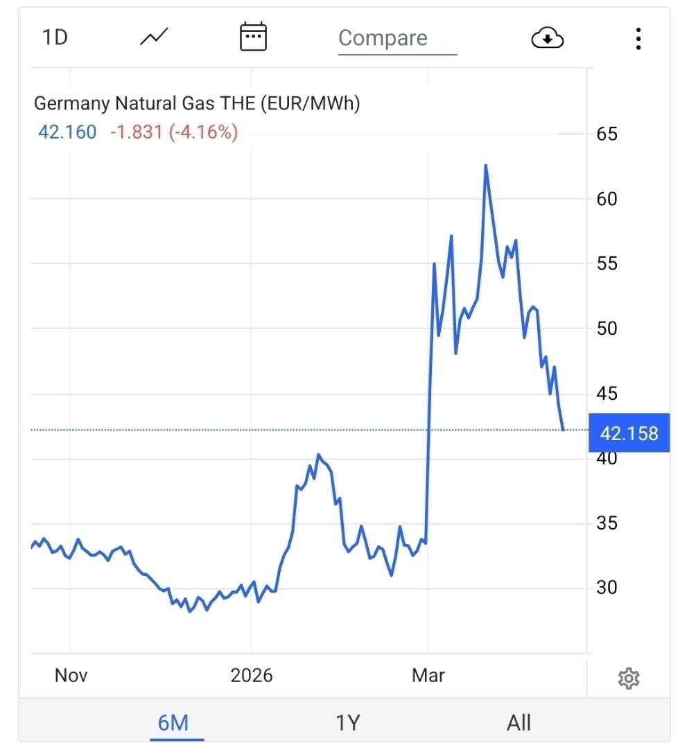 Der fallende Gaspreis in Deutschland (42 €/MWh) ist in Wirklichkeit der Geruch einer brennenden Wirtschaft. In einer gesunden Wirtschaft würde ein niedrigerer Preis die Nachfrage ankurbeln (Fabriken würden wieder öffnen).In einer "Selbstmordwirtschaft" sind die Fabriken verschwunden. Der niedrigere Preis spiegelt lediglich wider, dass das industrielle "Herz" Europas aufgehört hat zu schlagen.