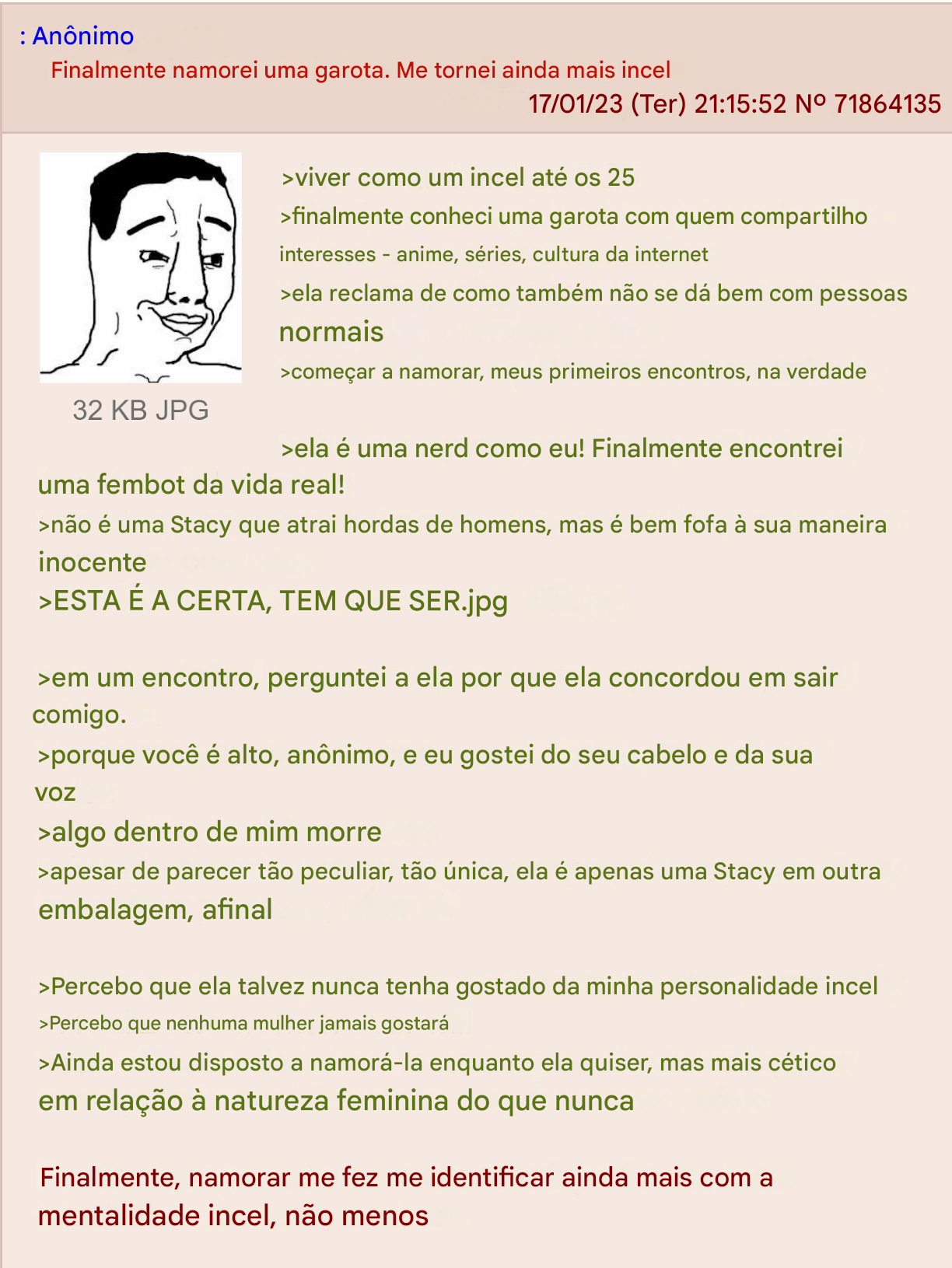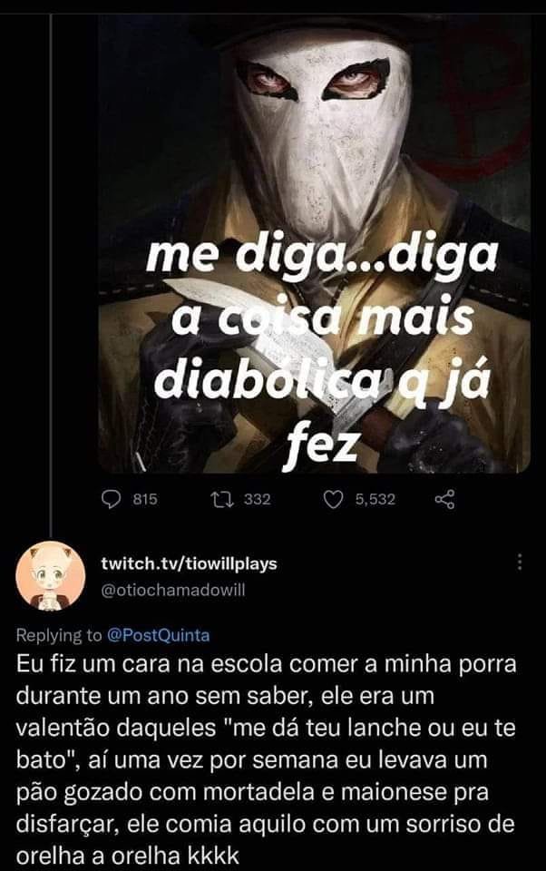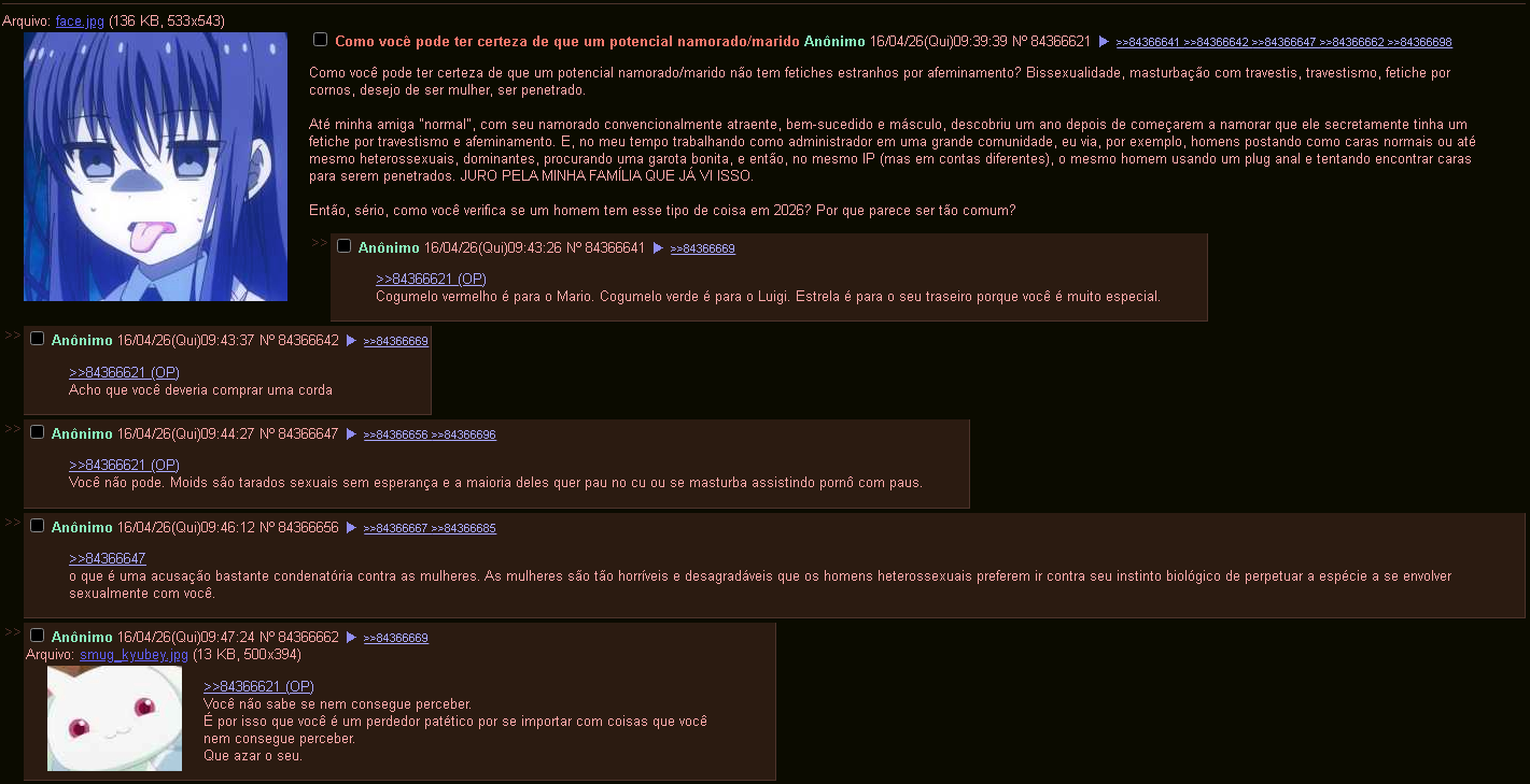 Puta que pariu cara, meu post será lido por sean keniti uchida, a merda do pedola, a merda do slip, e todas as merdas que são amigas dessas merdas, como eu copo com isso? A merda de um desempregado de 37 ou 38 anos espalhando a mensagem de como ele odeia a religimerda, um pedola que aparentemente era auditor fiscal e goonava pra CP, e um maconheiro fudido, que embora nem tenha nada demais, sempre que posto a merda tá online. Como eu explico isso?