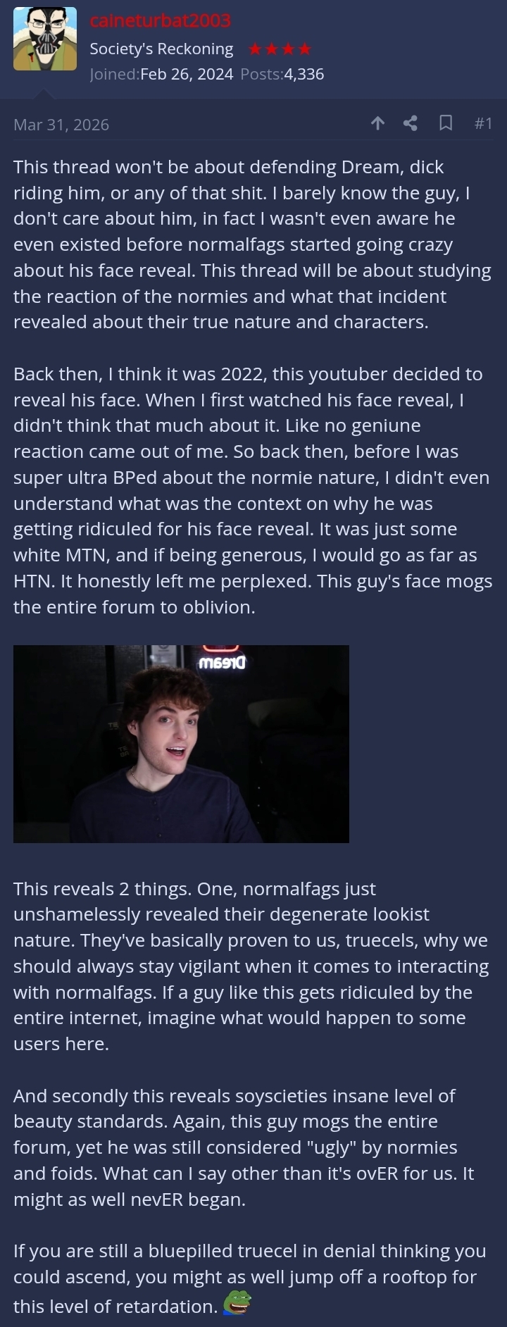 I like how croach larps as some giga ultra chud but he never touches on the WQ. Wignats never beating the allegations for being ultra simps for used whores.
