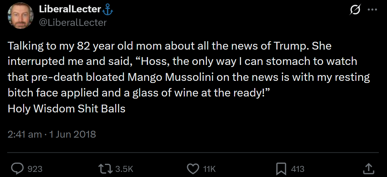 >>220768819There's a certain kind of older left leaning woman who genuinely expects applause whenever they call Trump or Farage a cunt