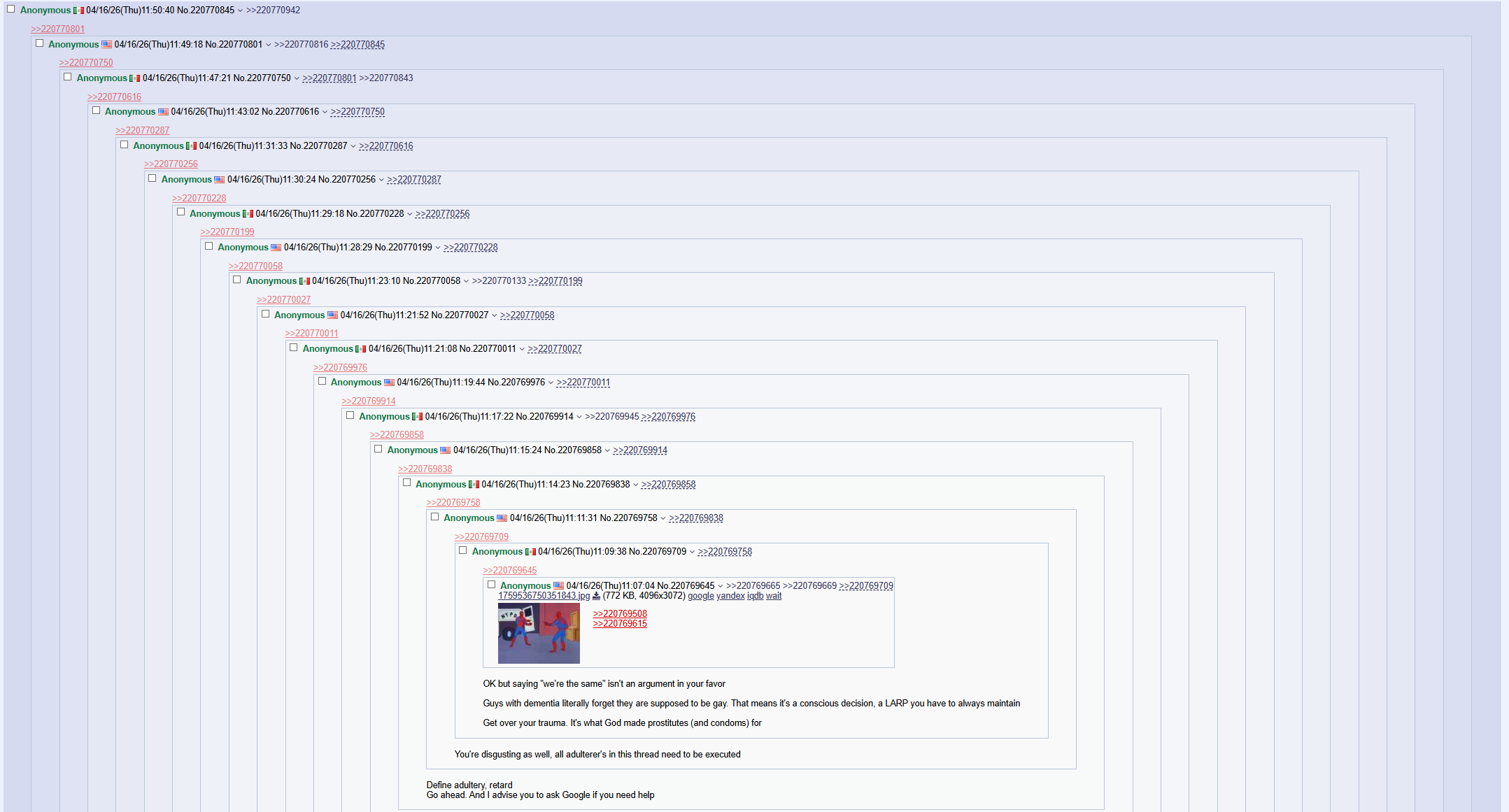 >>220769976>and god will make sure you burnAre you the one who will make sure that "god" punishes me?You didn't even know the difference between adultery and fornication just earlier