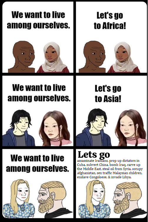 You know what I love doing? Talking over people. Especially talking over Venezuelans, Cubans, and Iranians. I love when some Gusano tells me>YOU MUST MAKE YOUR OIL AND ARMS OLIGARCHS RICHER SO MY GRANDPA CAN REGAIN HIS FORMER PLANTATIONS!and I just tell them to fuck off, lol. WWIII is not worth saving your brown ass, if these regimes were so bad just wait for them to collapse. If they aren't going to collapse, they aren't that bad.