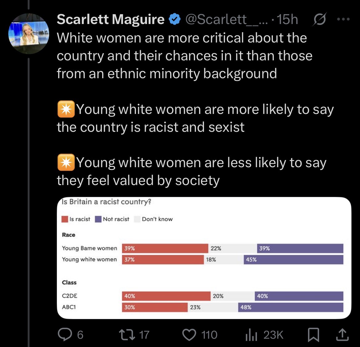 >>220773880>Poll literally says young BAME women are more likely to say the country is racist>Xitter retard makes it all about White women insteadWhat an embarrassingly obvious psyop.