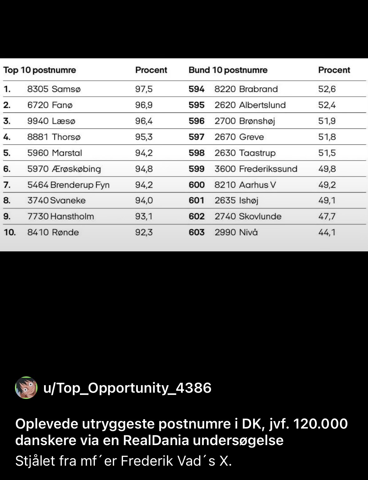 The top 10 postal codes where people feel the safest vs top 10 where they feel the least safestAnd yes, it's exactly how you think it is.