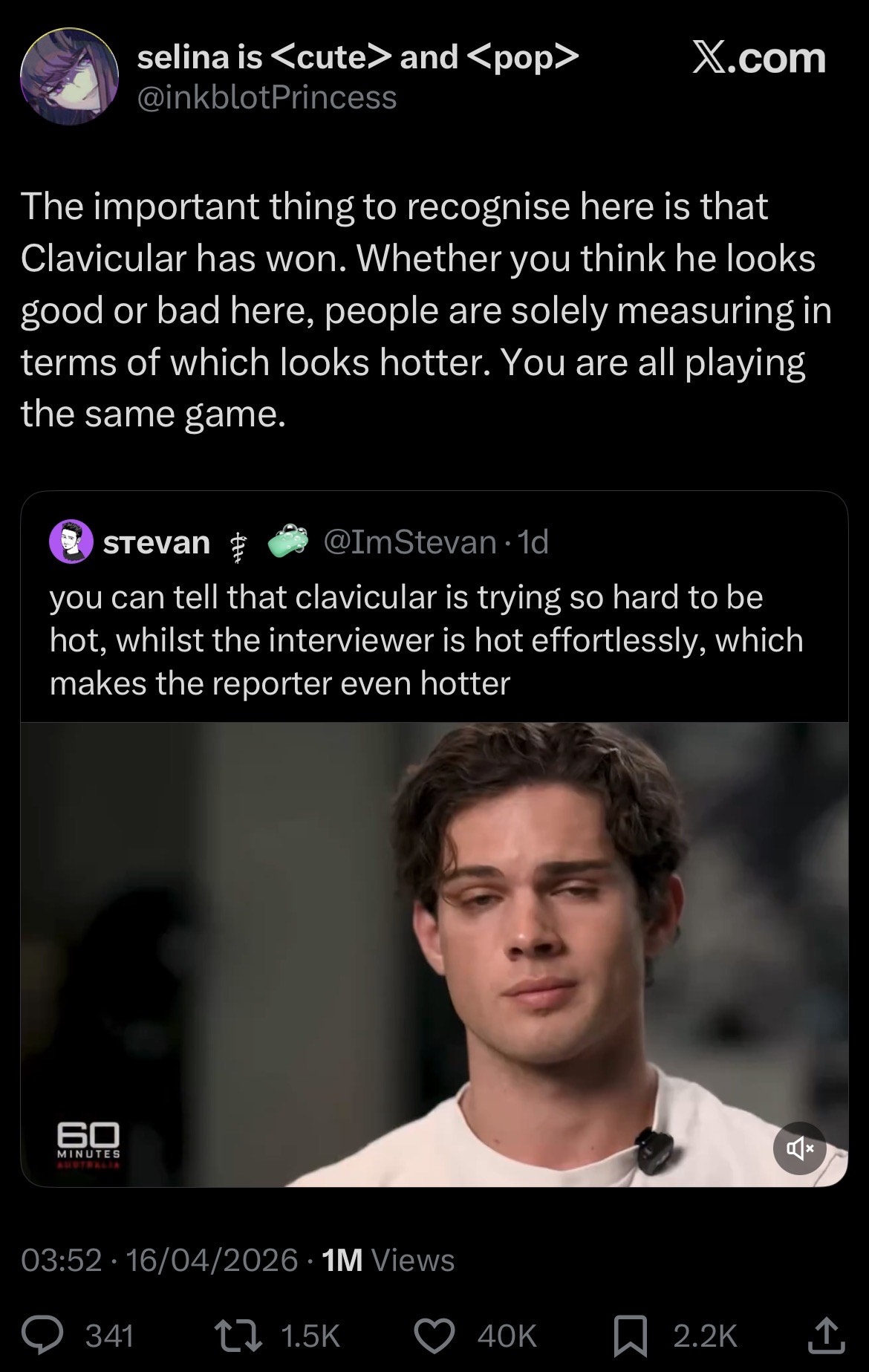 >>220779775yepthey could turn it into a discussion about how shallow we’ve become or insecurity amongst young meninstead it’s “omg you spoke to fuentes he’s a nazi are you a nazi??”