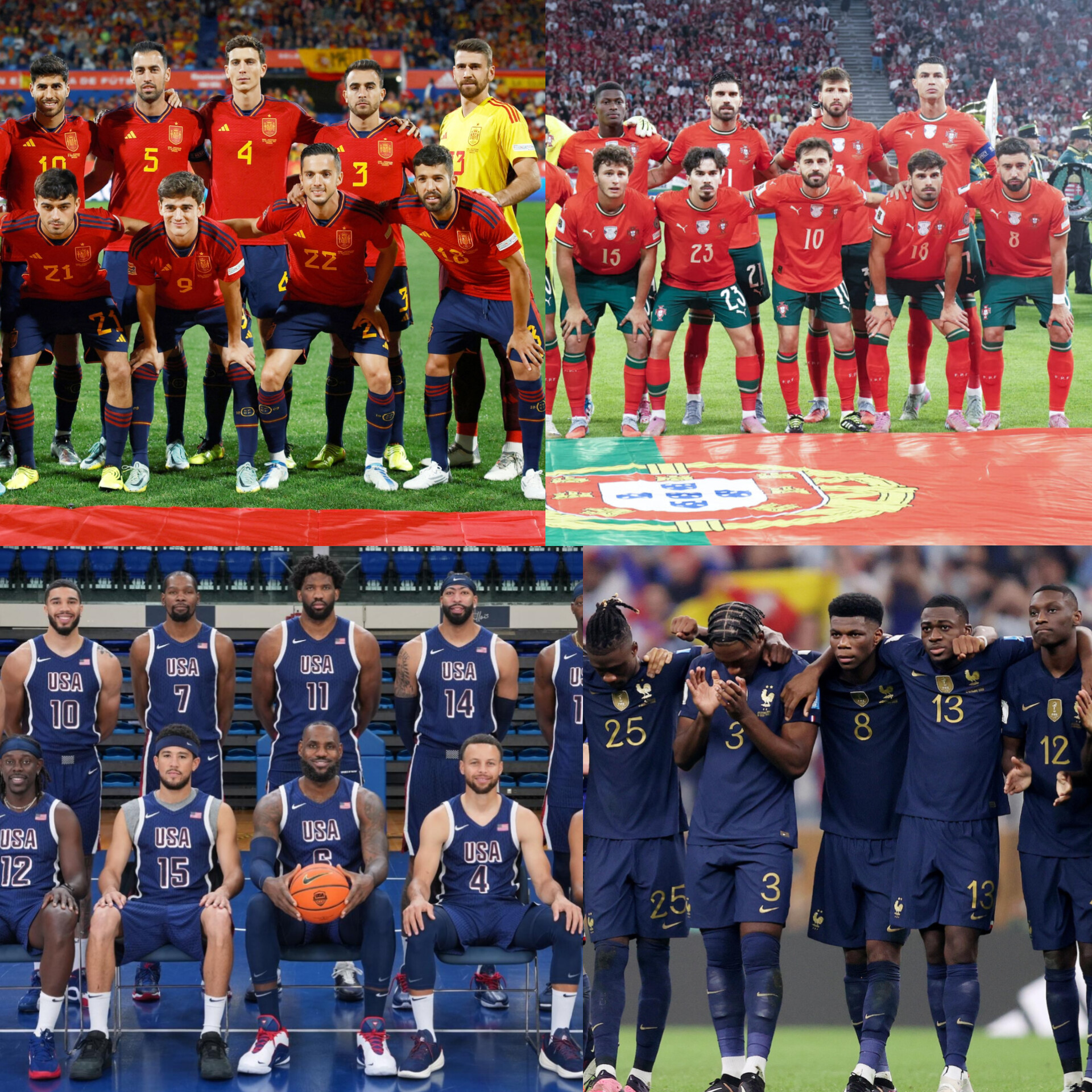 How beautiful to see how sport teams easily give us an idea of a country's demographic. On top of it, we can assume that these are chosen has the very best! Out of the millions of each of these countries population, they chose these men as the top 0.01%!!! They represent their flag ! Spain, Portugal, USA and France. Very fascinating