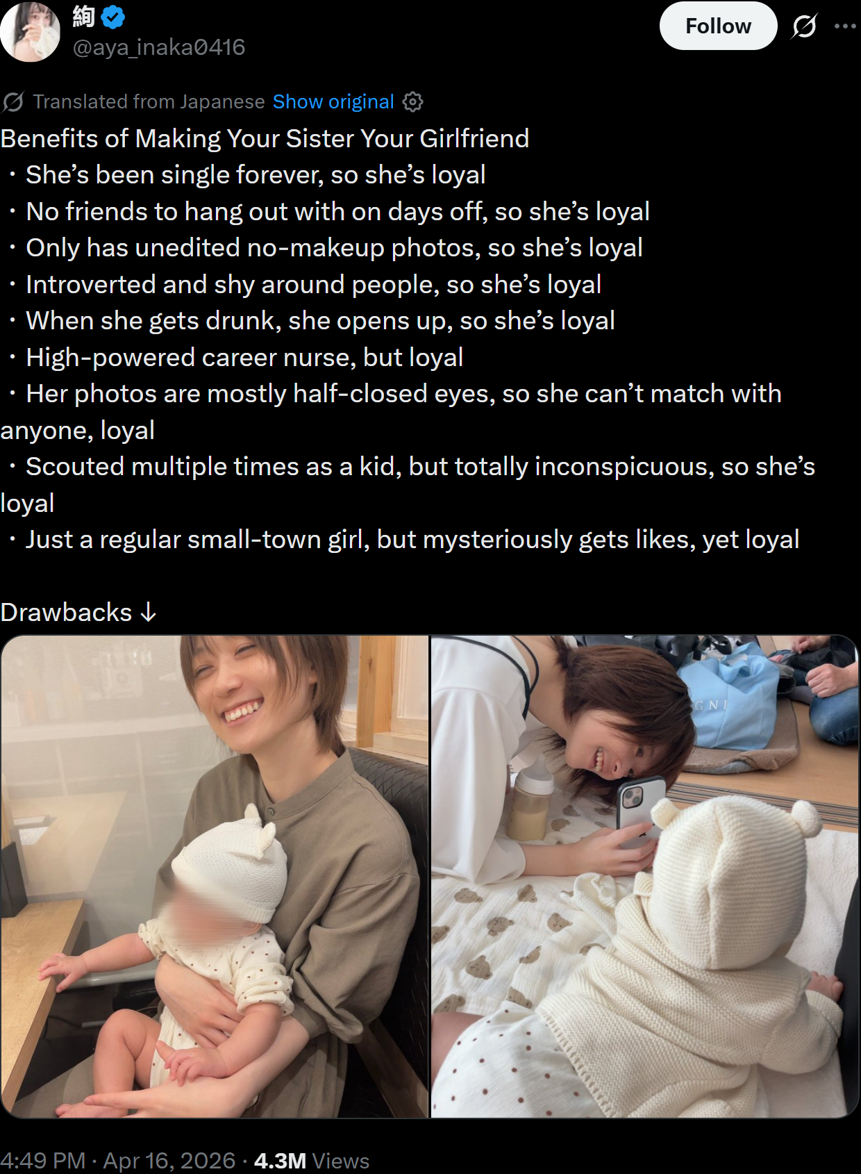 >>220800239>histhe account is clearly femaleI think the poster is a woman advertising her single mom sister to guysbut I choose to believe instead that it's a guy bragging about his sister-gf