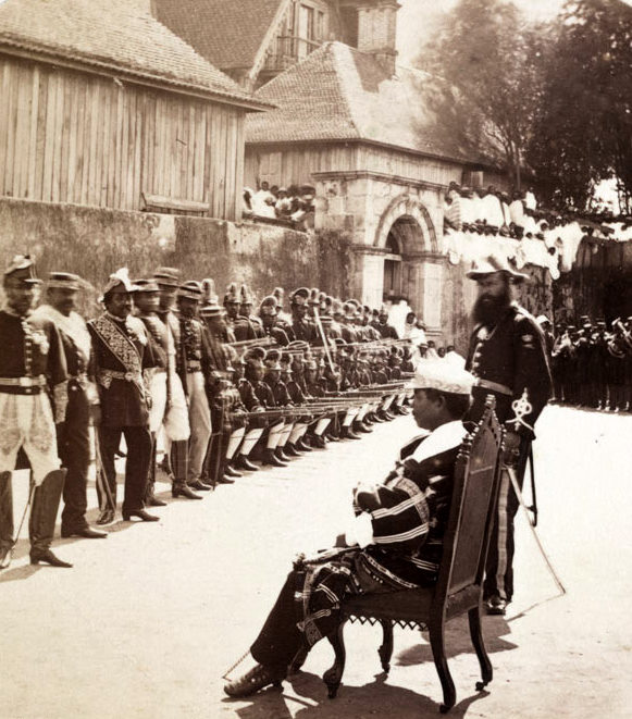 >Pith helmet in the Second French Empire style, worn by soldiers in the army of Ranavalona III. The inscription reads "Ranavalona III, [is the] Ruler of Madagascar"