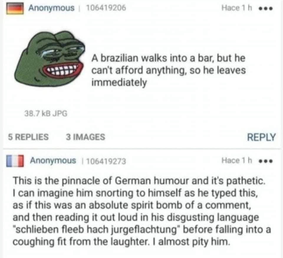 >>220806076Both of these anons are funny.HOWEVER, I don't think the German anon's joke is 'accurate' because the brazilian would likely stay and loiter even if he can't pay for anything.Still humerus.