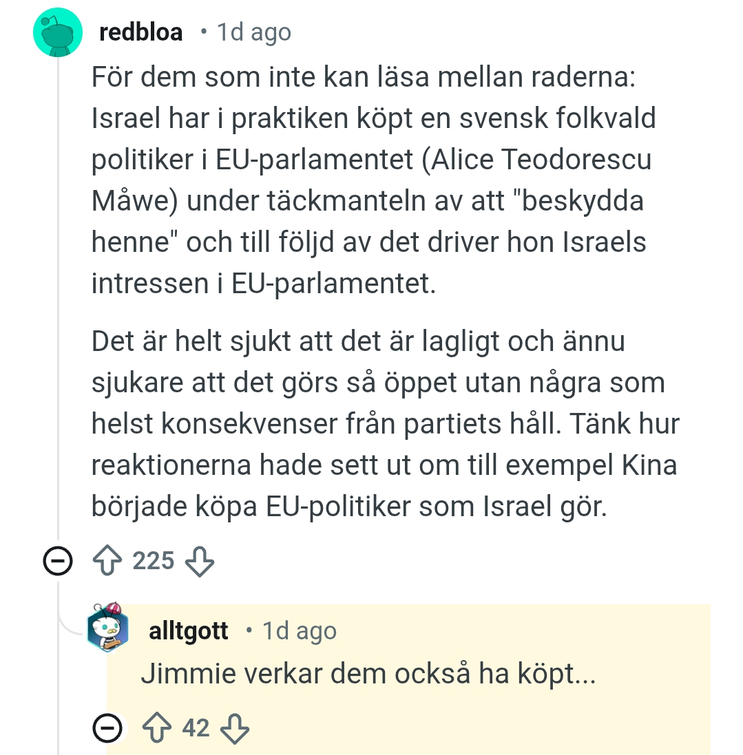 Sjukt att man öppet kan skriva att Israel/sionister mutar/köper upp svenska politiker för att gå Israels/sionisternas intresse på reddit och bli uppröstad, detta är något man hade blivit kallad nazist för bara för några år sedan.