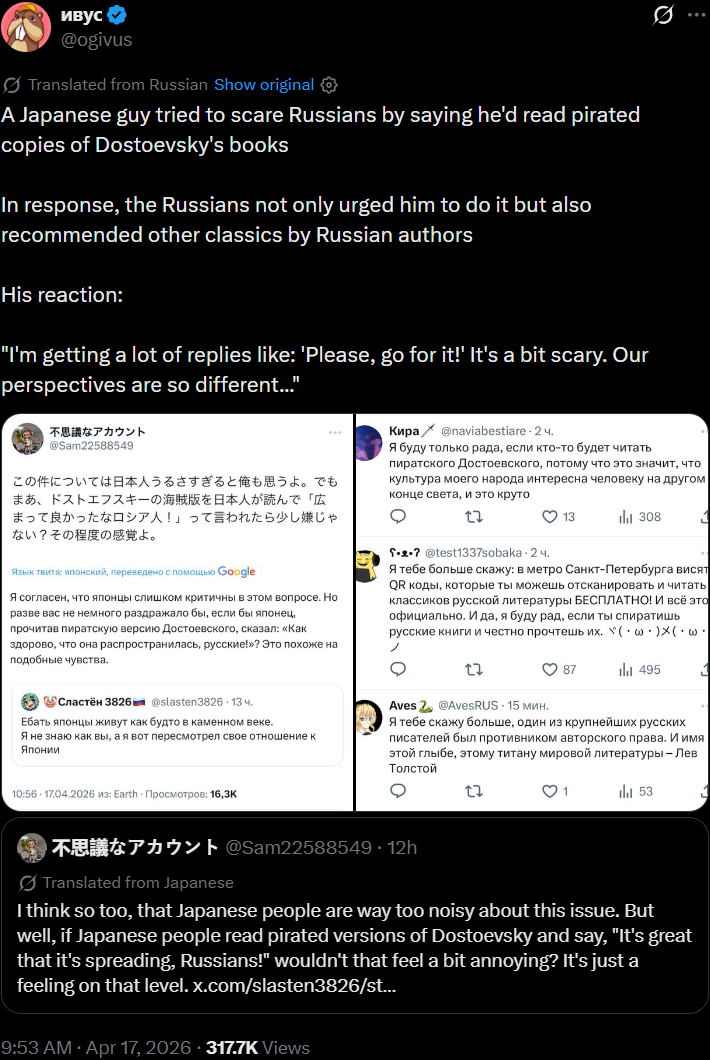 >>220804249Translation of Russian posts on the pic firstly from left picture, then from right picture, from up to down:>Cлacтён 3826: Fuck. Japanese people live as if they were in stone ages. I don't know about you, but I would reconsider my attitude towards this country.>Киpa: I would be only glad if someone is going to read pirated Dostoevesky. Because it means that the culture of my people is interesting for another peson from a different side of the world. And that's cool.>@test1337sobaka: I'll tell you more: There the QR-codes in the subway of Saint-Petersburg. You can scan them and read classics of Russian literature for FREE! And it's all official. And yes, I would be glad if you pirated Russian books and honestly read them.>Aves: I'll tell you more, one of the most famous Russian writers was against copyrights. And the name of this big person, this titan of world's literature is - Leo Tolstoy.