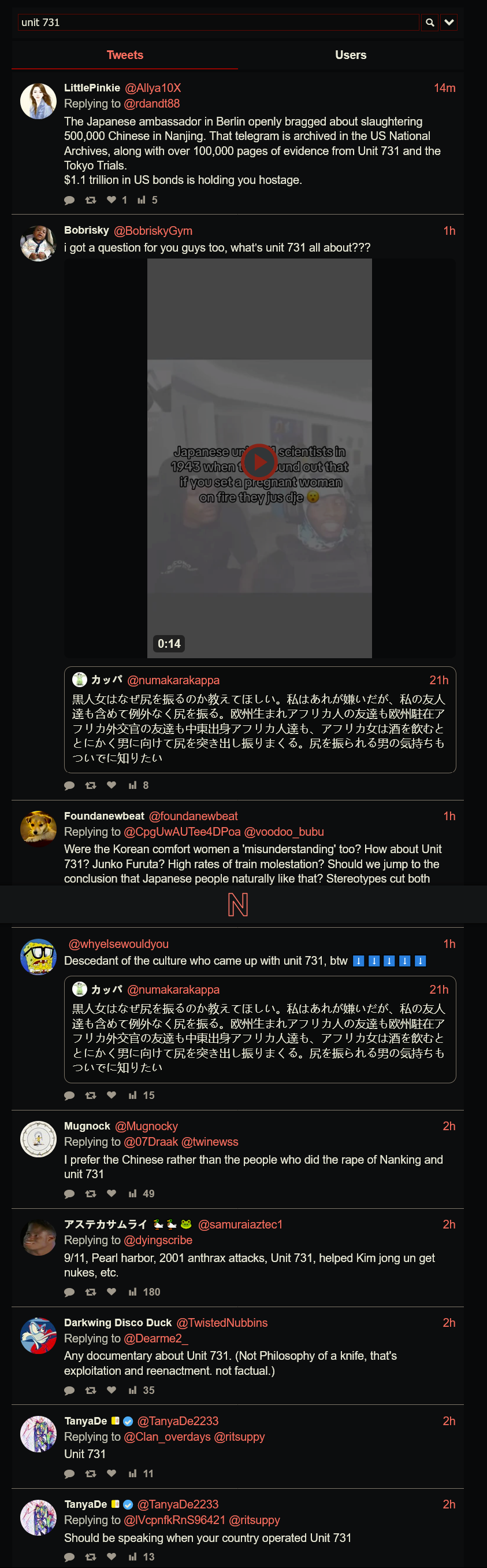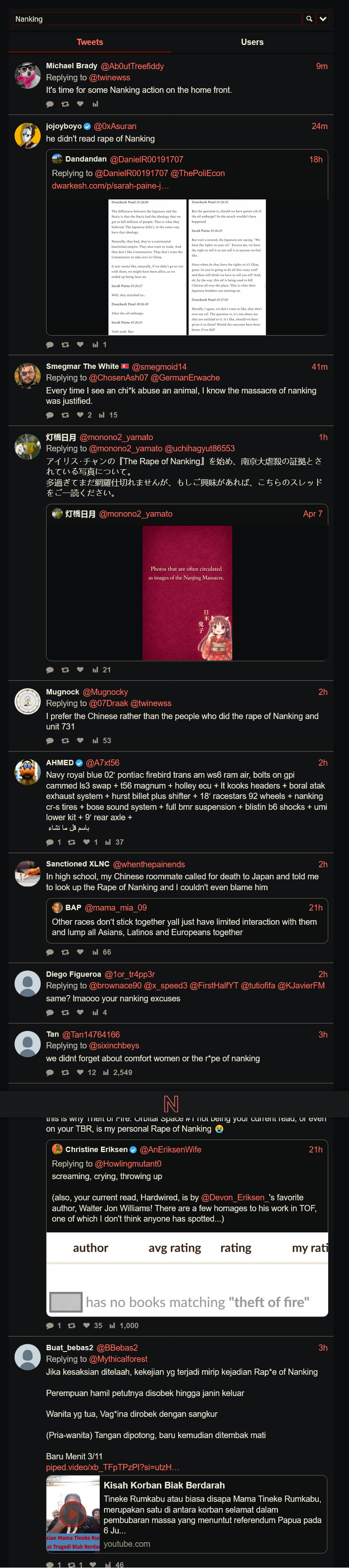 >>220807123>>220807152>>220807219>>220807244Seems like Japan is having a war with every country on Twitter.>stop pirating, WE DON'T DO THAT>stop committing war crimes, WE DON'T DO THAT>stop committing any crime, WE DON'T DO THATJap schizos on their side of Twitter interacting with everybody and calling everybody low moral criminals except themselves seemed to be a bad idea.