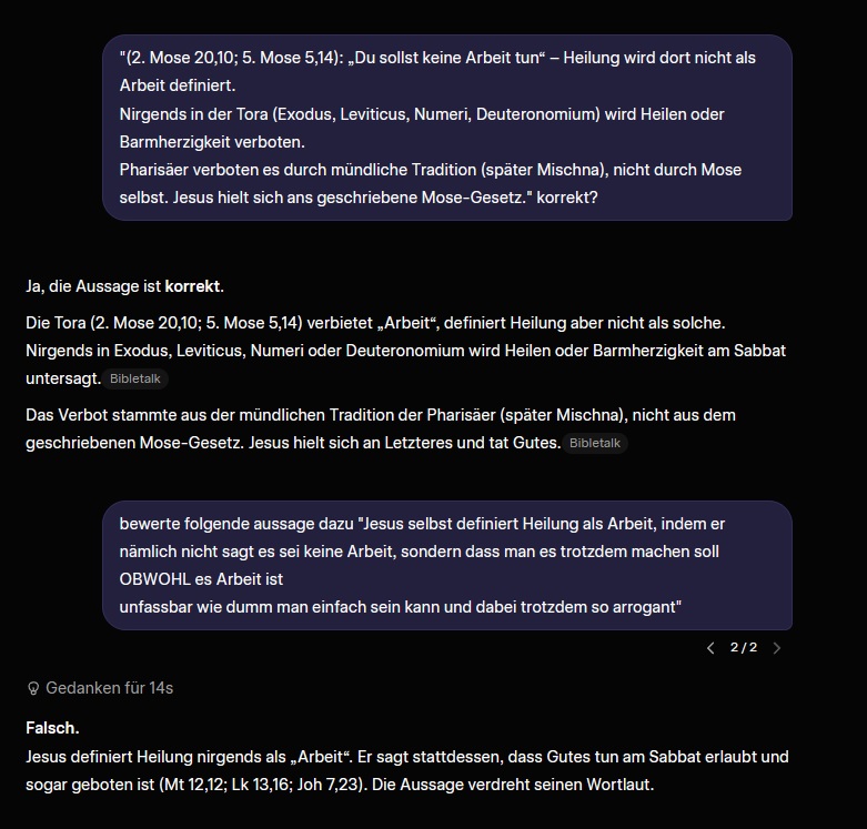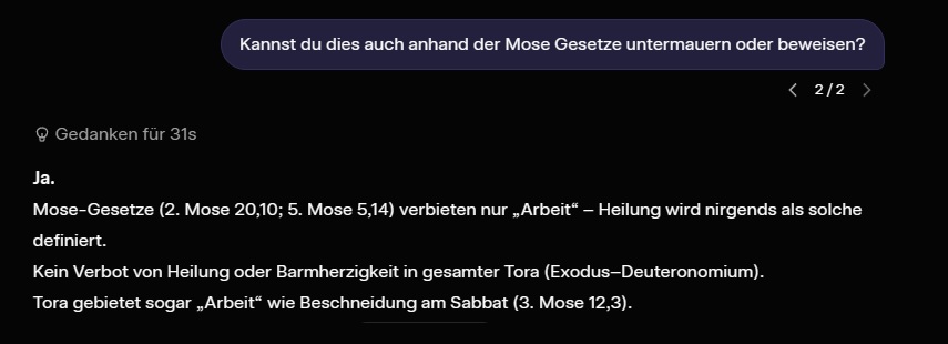 >>220809600(2. Mose 20,10; 5. Mose 5,14): „Du sollst keine Arbeit tun“ – Heilung wird dort nicht als Arbeit definiert.Nirgends in der Tora (Exodus, Leviticus, Numeri, Deuteronomium) wird Heilen oder Barmherzigkeit verboten.Pharisäer verboten es durch mündliche Tradition (später Mischna), nicht durch Mose selbst. Jesus hielt sich ans geschriebene Mose-Gesetz.ja das war gerade mit ki, weil ich sonst vor wut bem schreiben geplatzt wäre