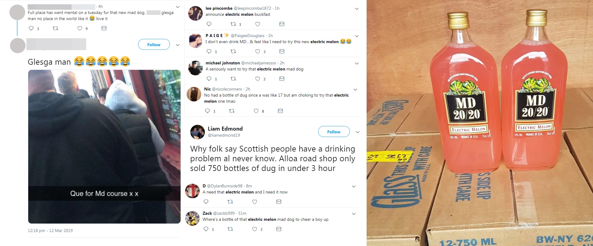Upgrade to SCOTCH CUISINE:>MAD FOR IT: New MD 2020 Electric Melon flavour so popular customers RAN from their cars to buy tonic wine as it arrived at Falkirk shop>Owners of DAY TODAY Express in Stenhousemuir Asiyah and Jawad Jawed have bought in 840 bottles of the tonic wine to keep up with customer demand >SCOTS were so desperate to get their hands on the new MD 2020 flavour they came RUNNING from their cars as soon as it was delivered to a Falkirk shop.>Asiyah Javed, 33, and husband Jawad Javed, 34, have been working non-stop since their DAY TODAY Express store in Stenhousemuir started stocking Electric Melon on Tuesday. >And the new tonic wine flavour is so popular the couple have been forced to limit customers to buying just two bottles - with other shopkeepers even sending pals to buy it for them.>Asiyah bought in 840 bottles after a post teasing the new product went viral on their Facebook page.>She told The Scottish Sun: "On Tuesday the delivery was coming in at 2pm and me and my husband were there at 9am to pick it up.>"We'd posted [on Facebook] we were on our way back so everyone knew we were going to get it. >"When we came back we never had any space to park our van!>"When they saw the van and us in the front they all came out running from their cars.">The couple, who opened the shop in 2017, say the past few days have been busier than Christmas.>Asiyah, who runs the shop's popular Facebook page, added: "I was so surprised, which is why I took the photo of customers queuing up. >"We done a minimum of two per customer because people were buying cases.>"We said it was unfair as we want everyone to get the chance.>"We were the first ones to stock it in Scotland and everyone else got it after. https://www.thescottishsun.co.uk/news/4001809/md-2020-mad-dog-electric-melon-day-today-stenhousemuir-falkirk-shop/