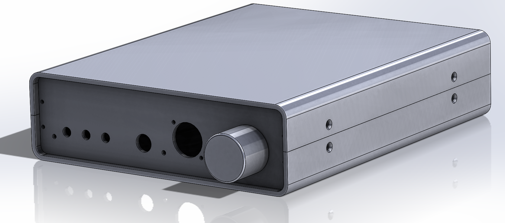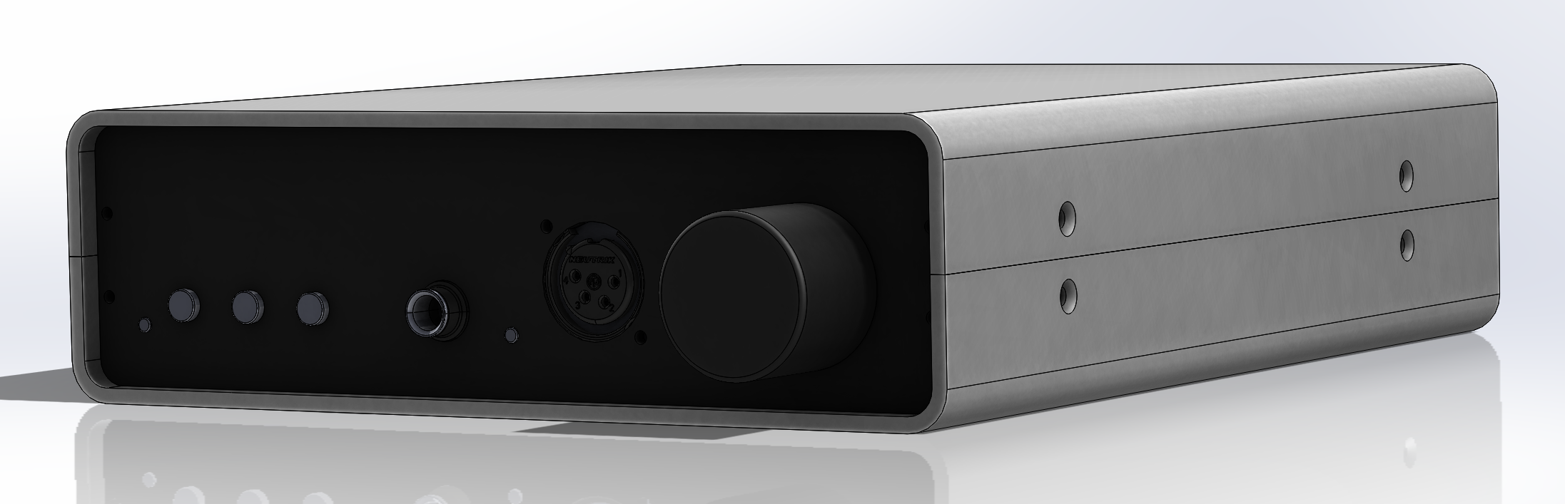 Amplifier enclosure designed and ready for quotations and production.I opted for something that would be easy and cheap to produce but sill be "stylish".It's basically four pieces, a front panel with all the holes for the buttons and connections, a back panel that's the same, and two equal bottom and top parts made by bending a single sheet of metal. The fact it's two equal parts makes it even simpler and cheaper.The material for the four parts is 3mm thick aluminium, that will be laser cut, bent and bored for the holes.The inside will have two extra aluminium blocks where both panels, top and bottom parts will screw onto. I could have prevented the use of screws for fixing the front and top panels by milling a groove in the top and bottom parts where the panels would slide in, but I think that would make the design more expensive. So I simply opted for normal threaded holes in the panels and will be using headless screws for a clean look.I also want to anodise the top and bottom with a gunmetal grey colour and then anodise or powder coat the panels in matte black for a very retro futuristic look.I'll finish by applying decals (painting services are too expensive) for the buttons and connectors' functions. I'm thinking about orange colour to alienmaxxxx the design./med/ thoughts?