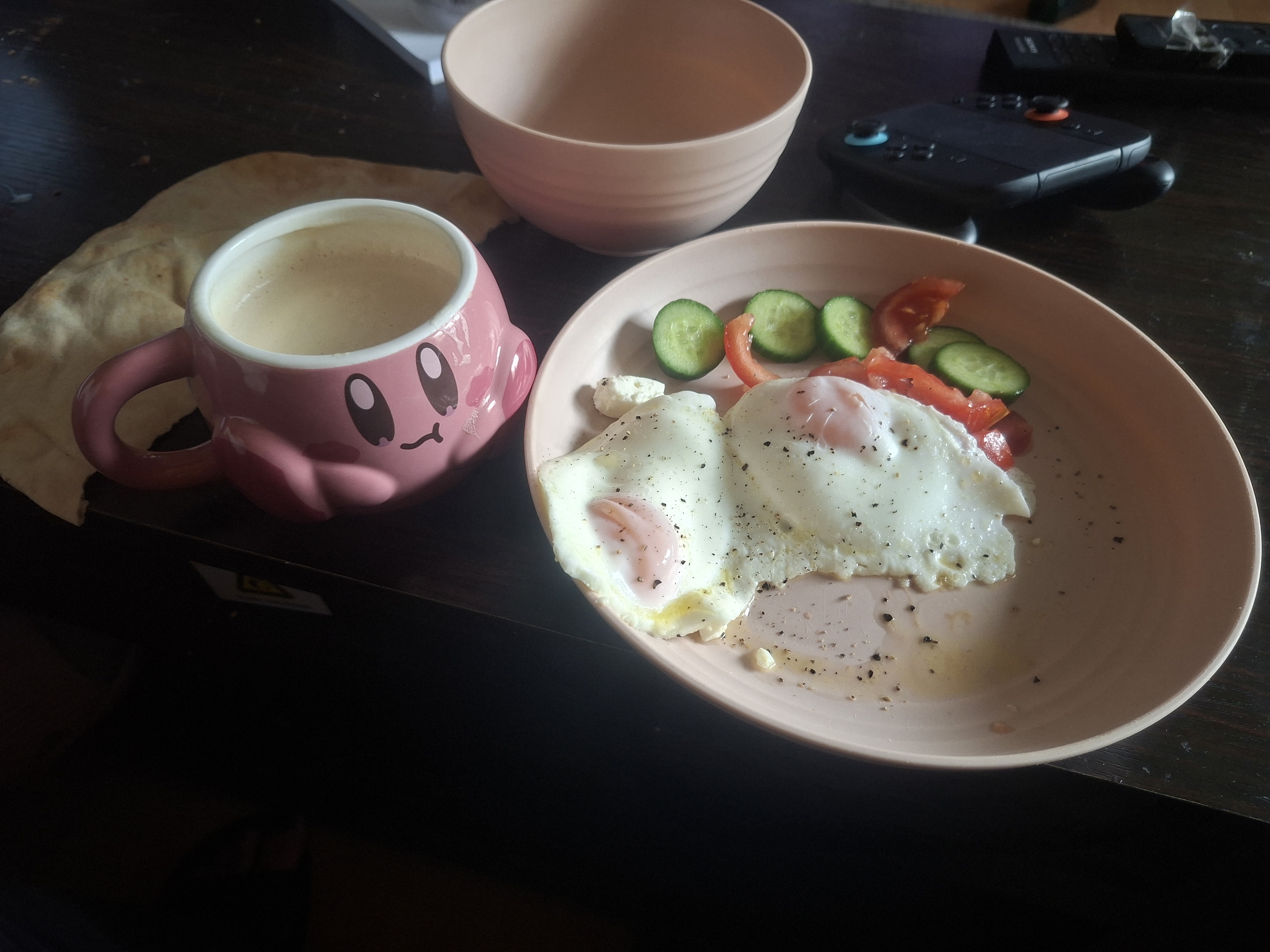 now behold the breakfast of an actual professional cook and take notes(leftover cold coffee in the cup)