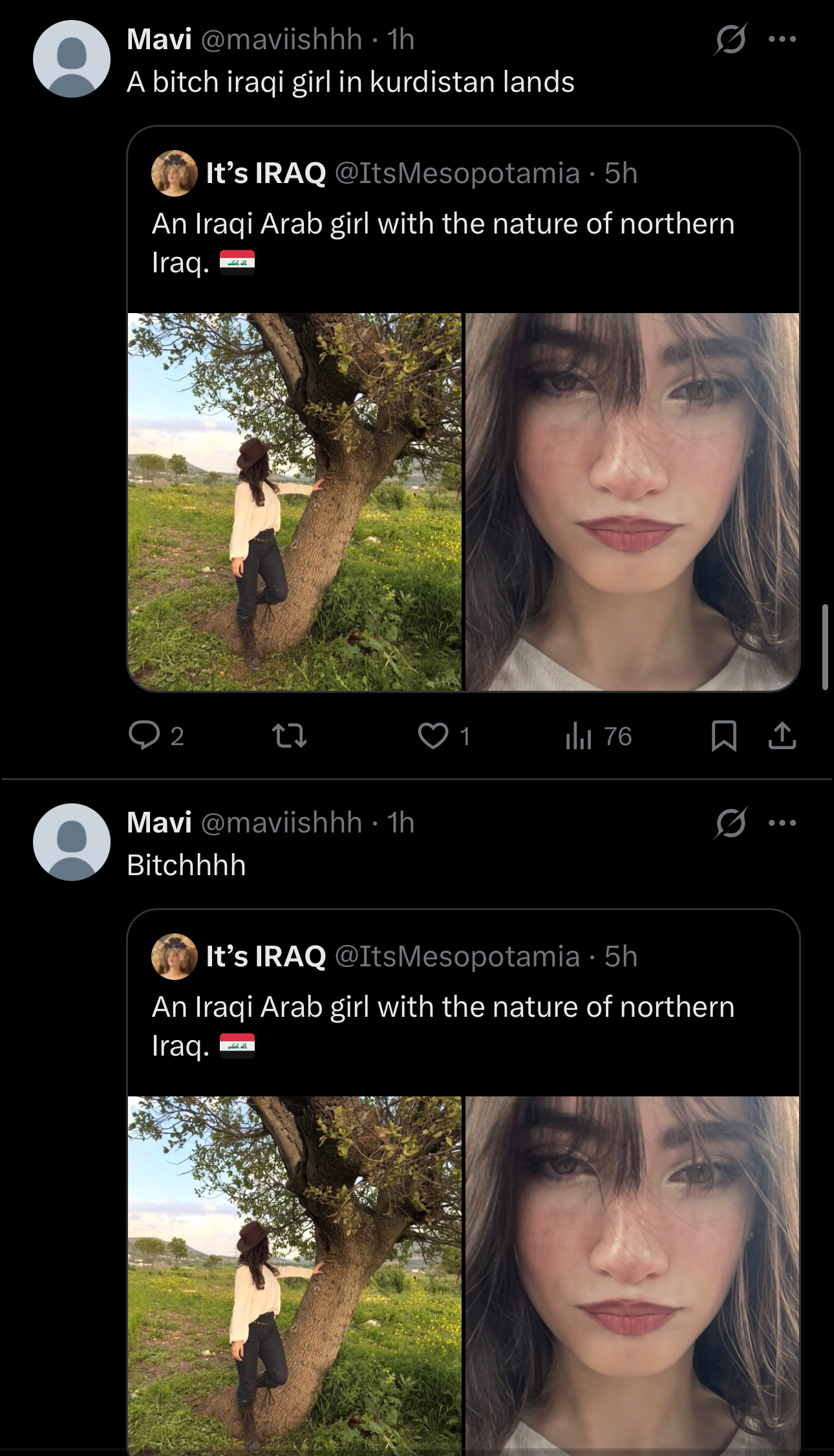 An Iraqi woman has made an X(formerly Twitter) post of her trip to Mosul and the entirety of Kurdish twitter has descended on her. Because she called it north iraq.Mosul lies in Northwestern Iraq, it is not part of the Kurdistan region nor does it have a significant Kurdish presence but Kurds believe it is theirs.https://x.com/ItsMesopotamia/status/2045556466484924794Happens in your cunt?