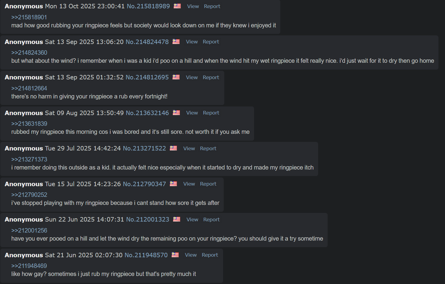 >>220836902me and my friend sucked each others willies when we were youngerI also once stuck a carrot up my bum whilst I wanked