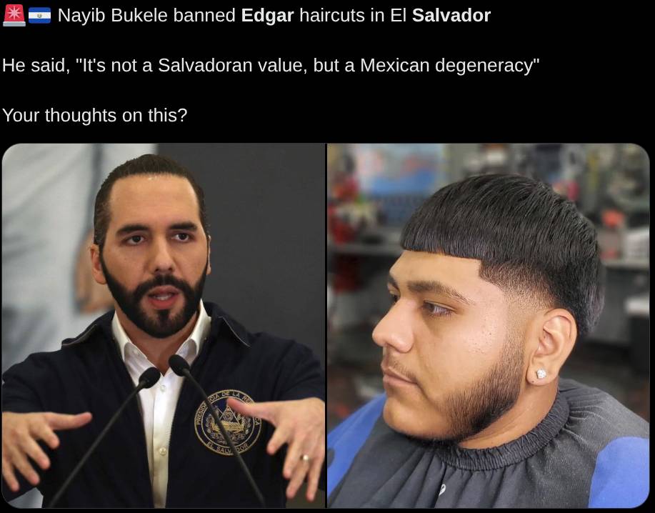 prohibir cortes de pelo si es muy pendejo, ademas de que bukele trae barba y un fade. en mexico no te aceptan ni como practicante de despacho si tienes vello facial, mucho menos un puto fade kekal final mexico si es una civilizacion aparte