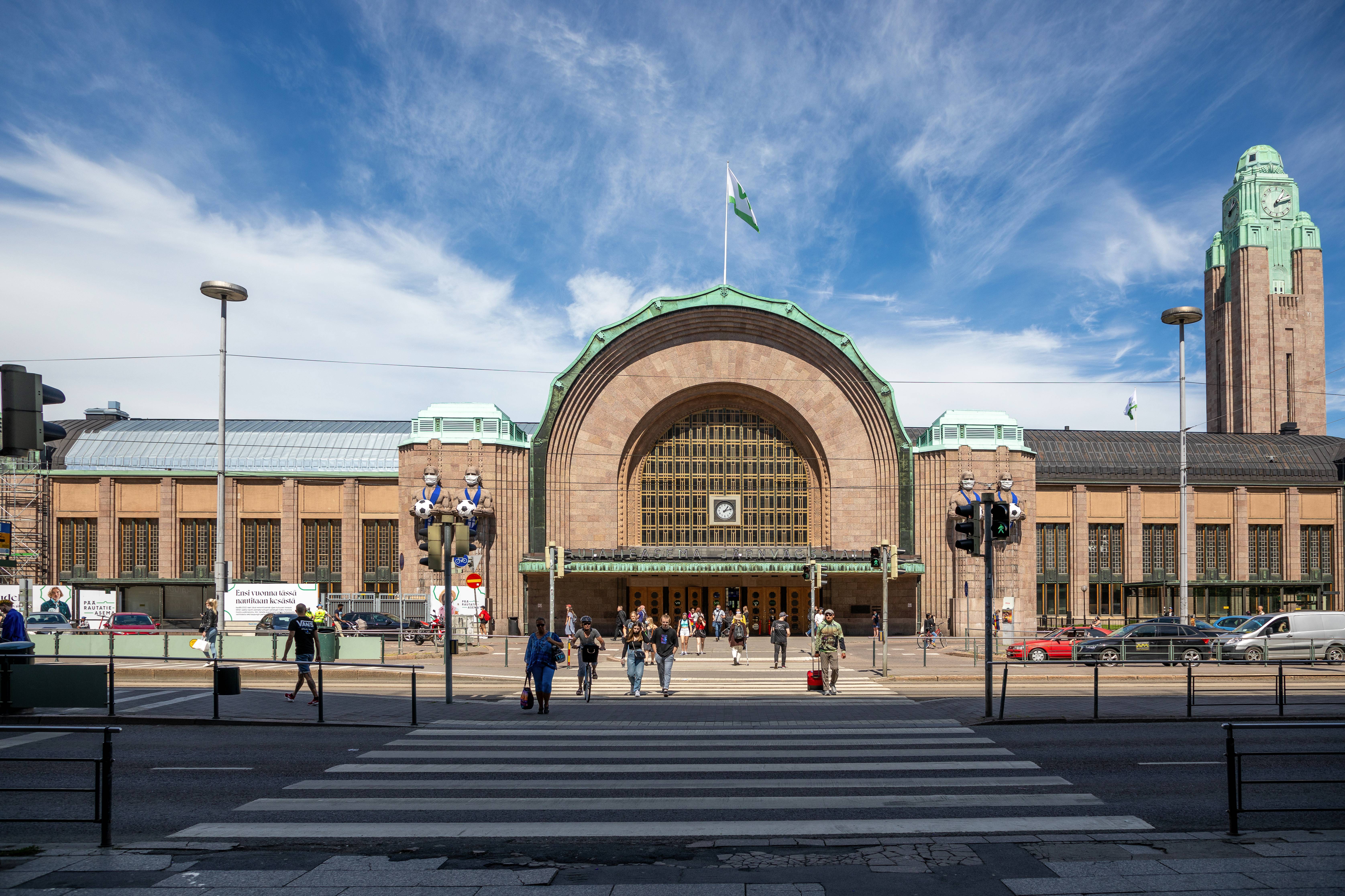 >Lyhdynkantajat ovat osa Eliel Saarisen piirtämän jugend-tyylisen rautatieaseman julkisivua.