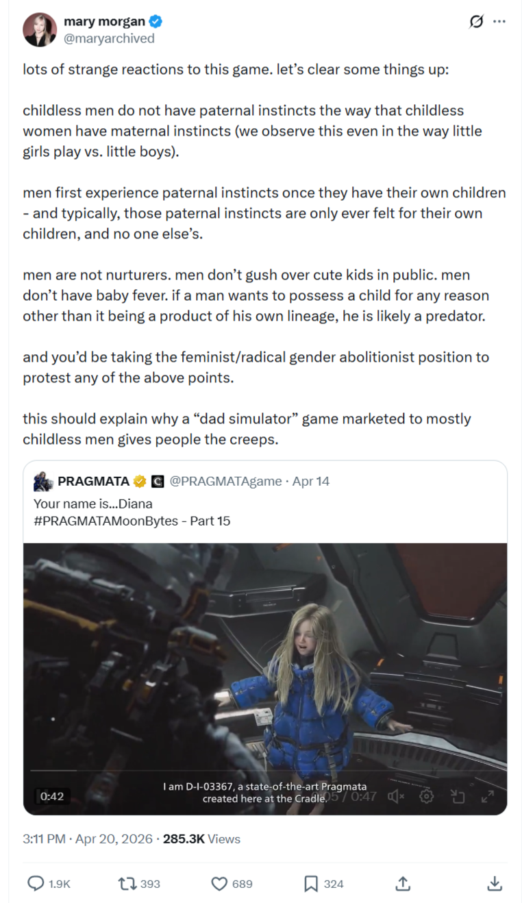 >a game about a robot child and a man come up>all the pedos make it their mission to spam about it being a pedo game ( its not )>all the femoids write books of twitter posts about how men cannot be fathers and how they cope about not having childrenOne game made so many people mad. its not a pedo game and women can go have their own daugheters instead of coping.