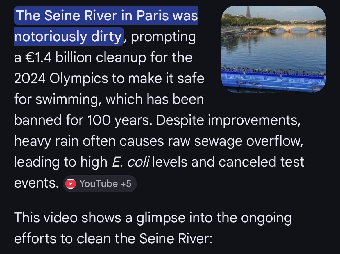 >>220874696During the “Olympics” the French river was so polluted you’d literally get aids if you swam in it.