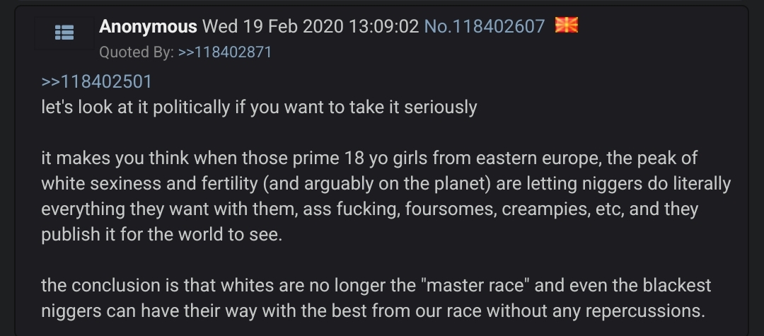I will post again https://desuarchive.org/int/thread/220772967/#q220778915 : revisited hating timetable v2:>8 am - 9 am : women>9 am -10 am : jews>10 am - 11 am : blacks>for the croat: 11 am - 12 am : russians>12 am - 1 pm : troons>1 pm - 2 pm : arabs>2 pm - 3pm : gypsies>3 pm - 4 pm : turks>and then you can rest and sleep happy. or work, those are work hours.The time to hate women is over for the day.