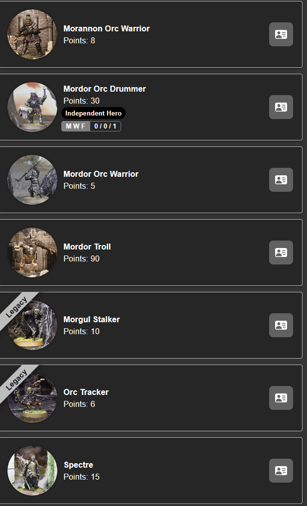 >>220888921Minas Morgul has to bring The Witch King, and for other leaders they can bring Ring Wraiths or a variety of orcs. Then for regular guys you can bring a bunch of different orcs and some ghosts/spectres and also Trolls.