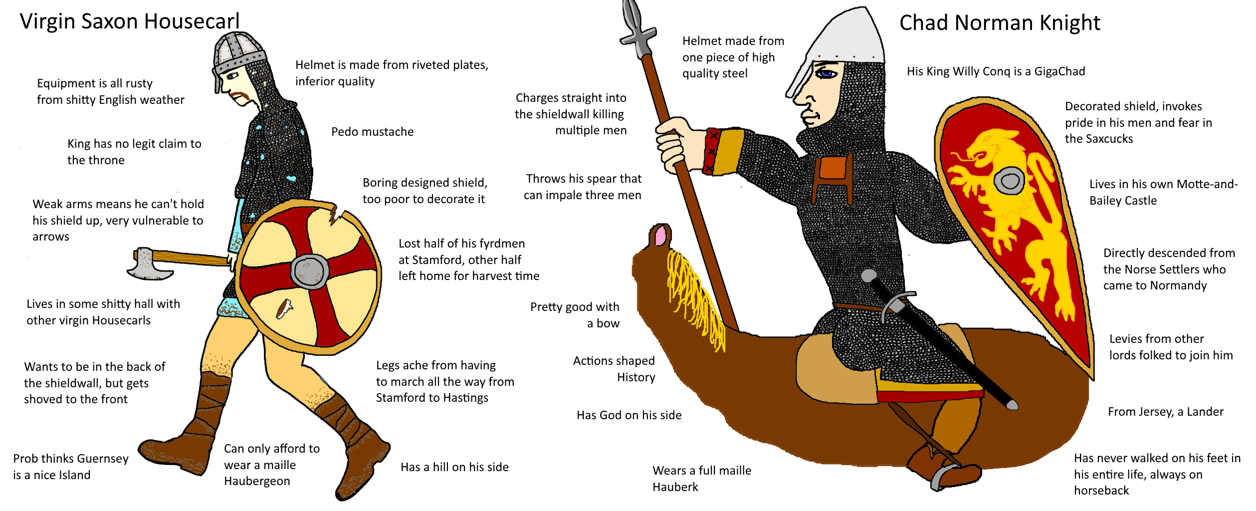 >>220898524>>harold randomly loses 40 IQ points and does the only dumb thing of his reignwell from what I know this is a flawed interpretation because it looks at Harold's army like it's a modern day professional national military not a medieval levy centric armymost of his soldiers were fyrd peasant militia, if he had waited much longer he would have faced mass desertion as it was already october and those men would have wanted to be home for the ploughing and sowing season to avoid starvation the following year, meanwhile William's army had no problem just raiding and stealing the food they neededalso William specifically targeted sussex and the Godwin family's personal fiefdoms with his raiding parties, directly targeting Harold's powerbaseI really should learn more about this fascinating topic, perhaps get some bookslop on the Normans>And a thousand years later, we brythonic atlanto-celts still live under the yoke of Anglo-Normans. Clown universe.the fact England's national motto is "Dieu et mon droit" will always be hysterical to me