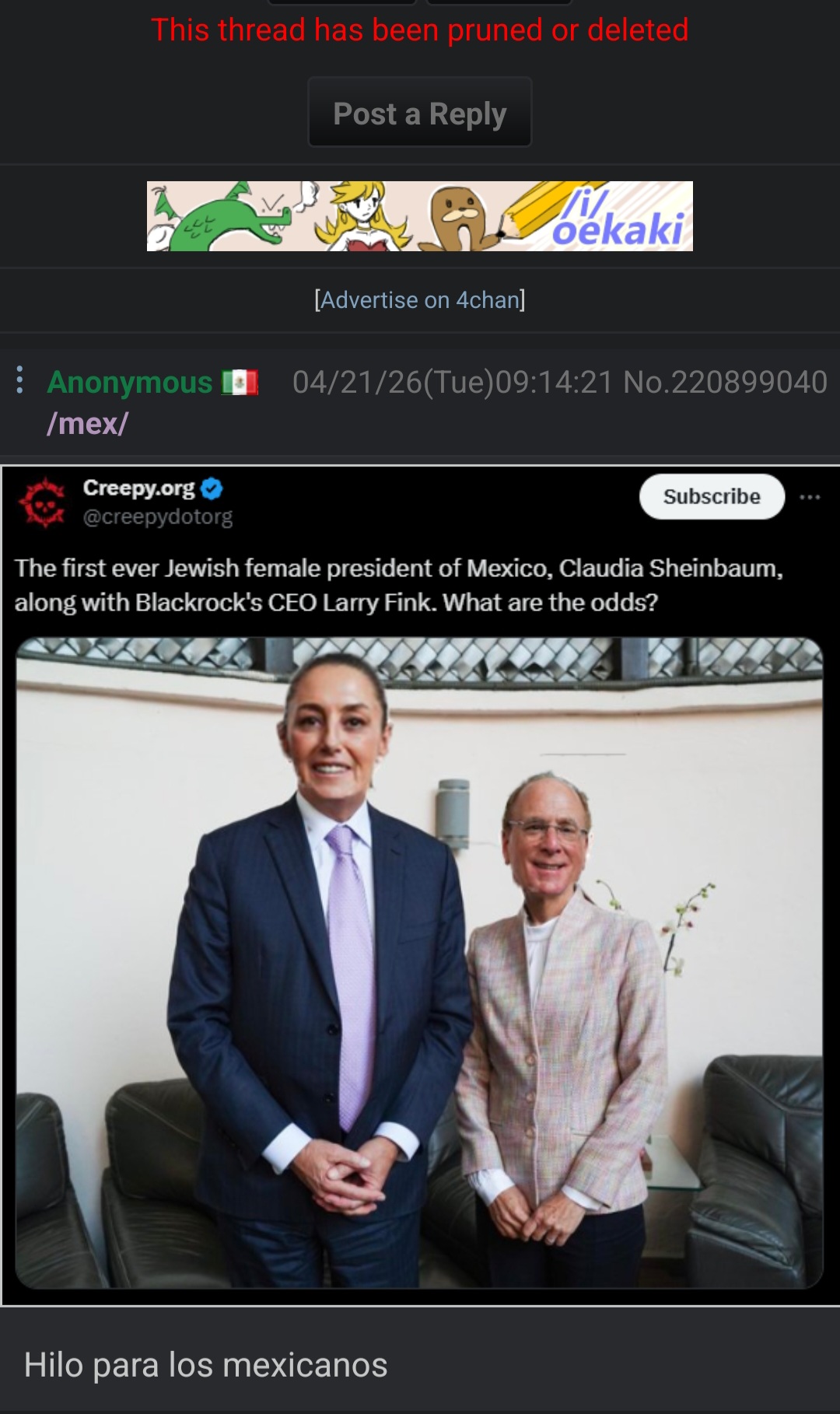 Piece of shit janny got assblasted because I posted the Mexican president in the OP of the Mexican threadI'll be paying them a visit on the IRC channel soon