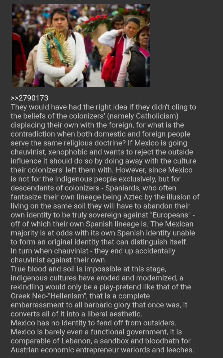 El conflicto nace porque los mexicanos no pueden aceptar que la cultura hispana es objetivamente un pedazo de mierda inferior al resto de europa, y sin embargo, se niegan a soltarlaQuieren creer que alguna vez estuvimos al nivel de estados unidos, lo cual es falso. O que en algun momento el imperio rivalizó a inglaterra en gloria, lo cual es falso. O que hubo algo de noble en la destrucción de mesoamerica, lo cual es falso. O que la colonia fue benigna, lo cual es falso.La verdad no puede nacer de la mentira. Es por eso que el hispanchismo esta condenado a morir. El indigenismo es mas noble por razon de que se sustenta en las honradas gentes nativas del continente. Pero querer reconciliar al hispanchismo con el indigenismo es imposible. Los indigenas fueron a la guerra para expulsar a los gachupines y ser libres. El indigenismo es mas noble porque es un espiritu de libertad por naturaleza, irreconciliable con todo lo demás.
