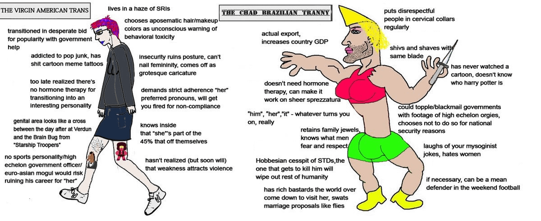 >>220908629Western trannies are all broadly insane and annoying degens who demand that you take their fetish seriously while not even being as hot as the asian ones. They destroy and groom every institution they're apart of and if you ever see one in real life they're going to be like 2m tall and balding with an uncanny skeletor face. Even if they're hot they're still bothersome and vile. Literally worse in every way.
