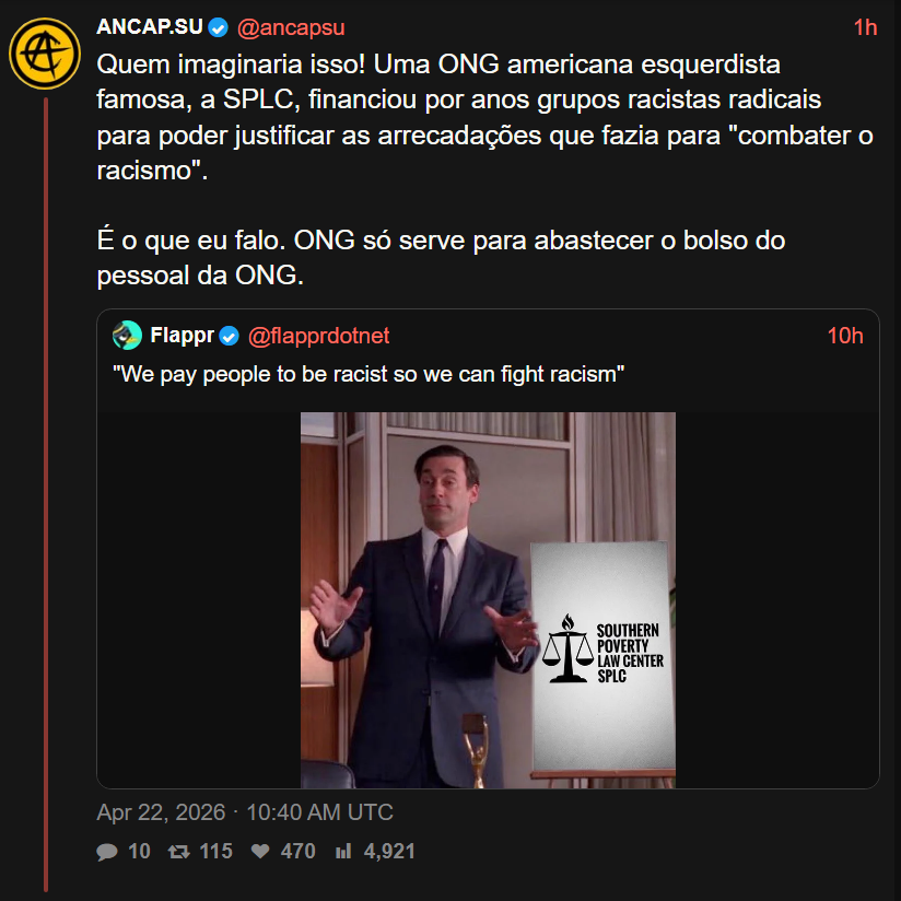>financiou por anos grupos racistas radicais para poder justificar as arrecadações que fazia para "combater o racismo"nossa, quem diriaserá que isso acontece também aqui?