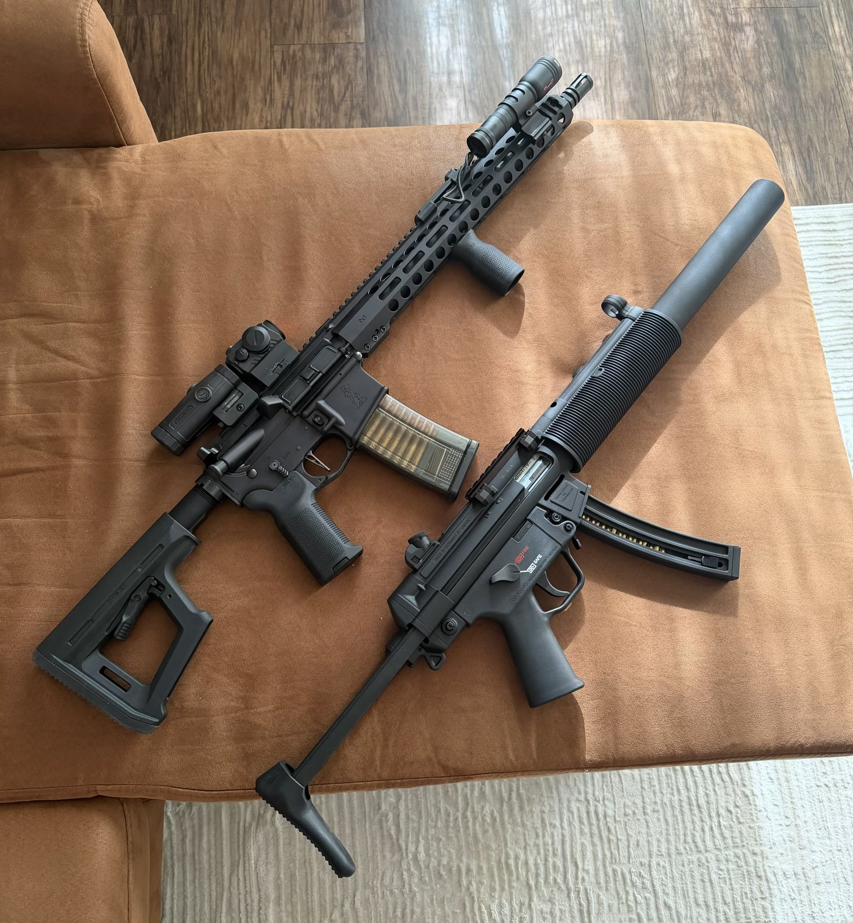 >>220937916Yes, I'm guessing it isn't an SBR, which means the barrel length needs to be at least 16 inches which is exactly what it looks like, judging by the 16 inch AR right next to it. The MP5SD has an integrated suppressor (non-removable), so the suppressor counts as part of the barrel length.