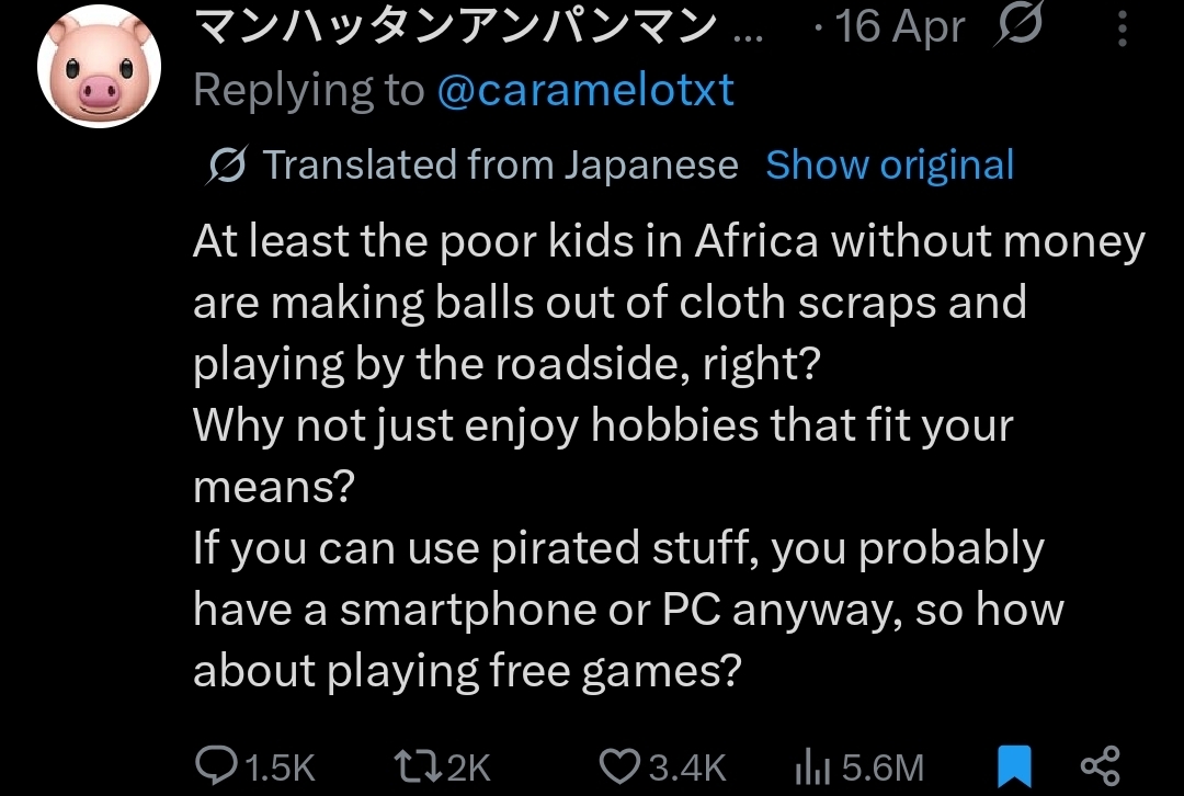 >>220972335Poor third-worlders said they pirated jap media because they can't afford it and the Japanese said they should live within their means and play with a string instead. They are also paranoid about black people killing them 24/7 when there are no black people in Japan.