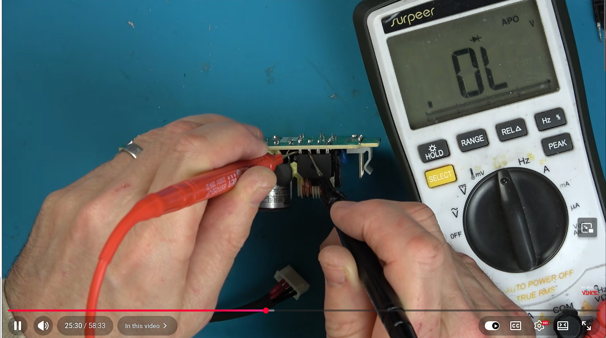 O Vince parece não estar sendo muito cientifico e lógico ao medir a ponte retificadora lel, ele parece estar "chutando" que a medida deveria ser de um jeito... Ele poderia desenhar rapidinho o esquema com os 4 diodos e meditar sobre isso antes de medir, e depois usar IA pra confirmar a hipótese, e depois medir. :/