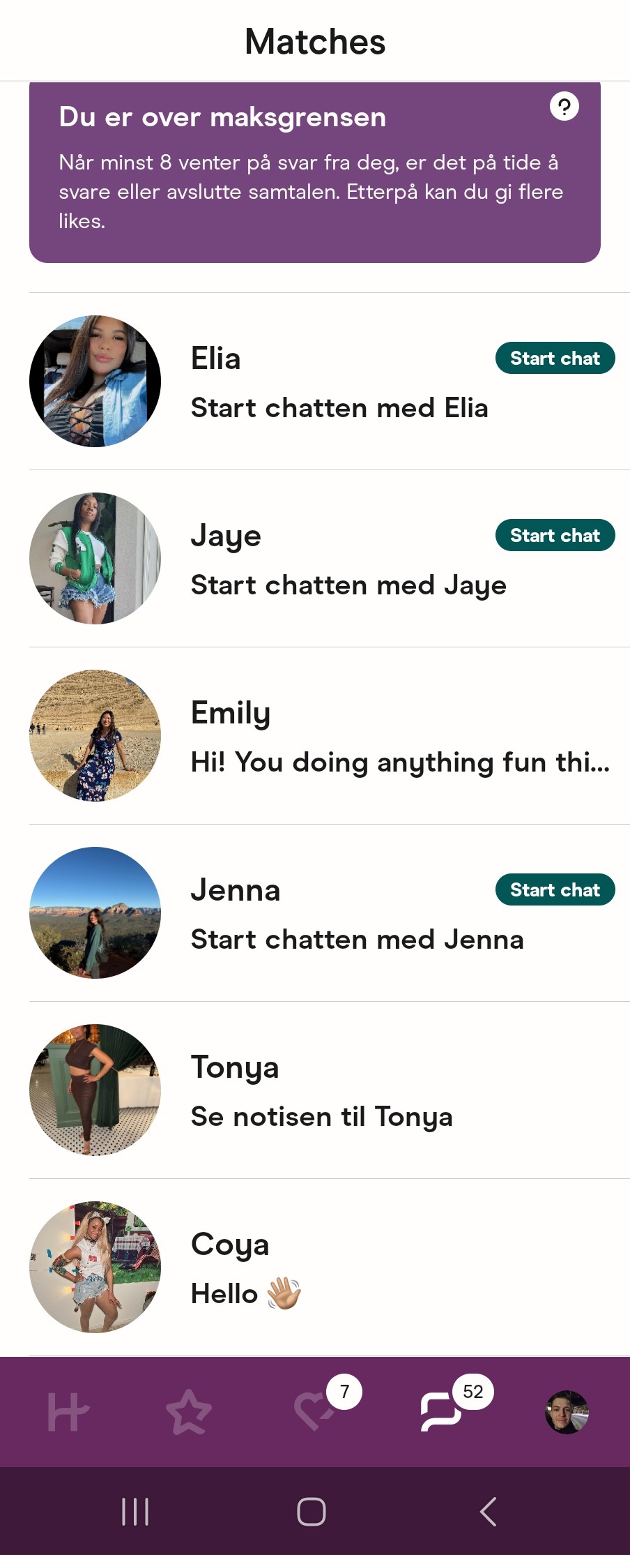 Tinder er jeg aldri på. Faktisk jeg som ikke engang oppsøker damer kan være så uheldig at ei dame kan bli gira på noe for eksempel på fest. men da må jeg rett og slett si at «Nei, jeg er faktisk ikke noe kjekk, vi står i mørket, jeg ser jævlig ut i dagslys, dårlig hud»
