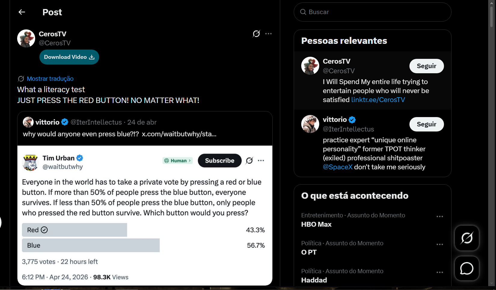 Also, the fact that the blue button won after going around in the "might makes right" twitter sphere is embarrassing for these knuckle dragging chuds that think that the rest of society are mindless apes like them.