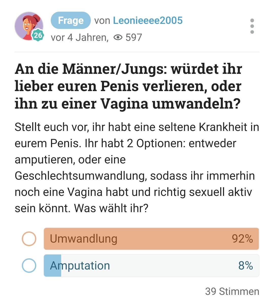 >>221017345>Nä,selber!Ja, das hat meine 4jährige Schwester damals auch immer zu mir gesagt.Fühlst du dich denn auch als 4jähriges Kind? Als Junge oder Mädchen?Es gibt da nämlich eine Diagnose die besagt, am Tag der Schändung bleibt man mental hängen. das könnte hier auf dich zutreffen. Aber es gibt eine Behandluing, also die Hoffnung ist nicht verloren.Du musst dir nur helfen lassen.